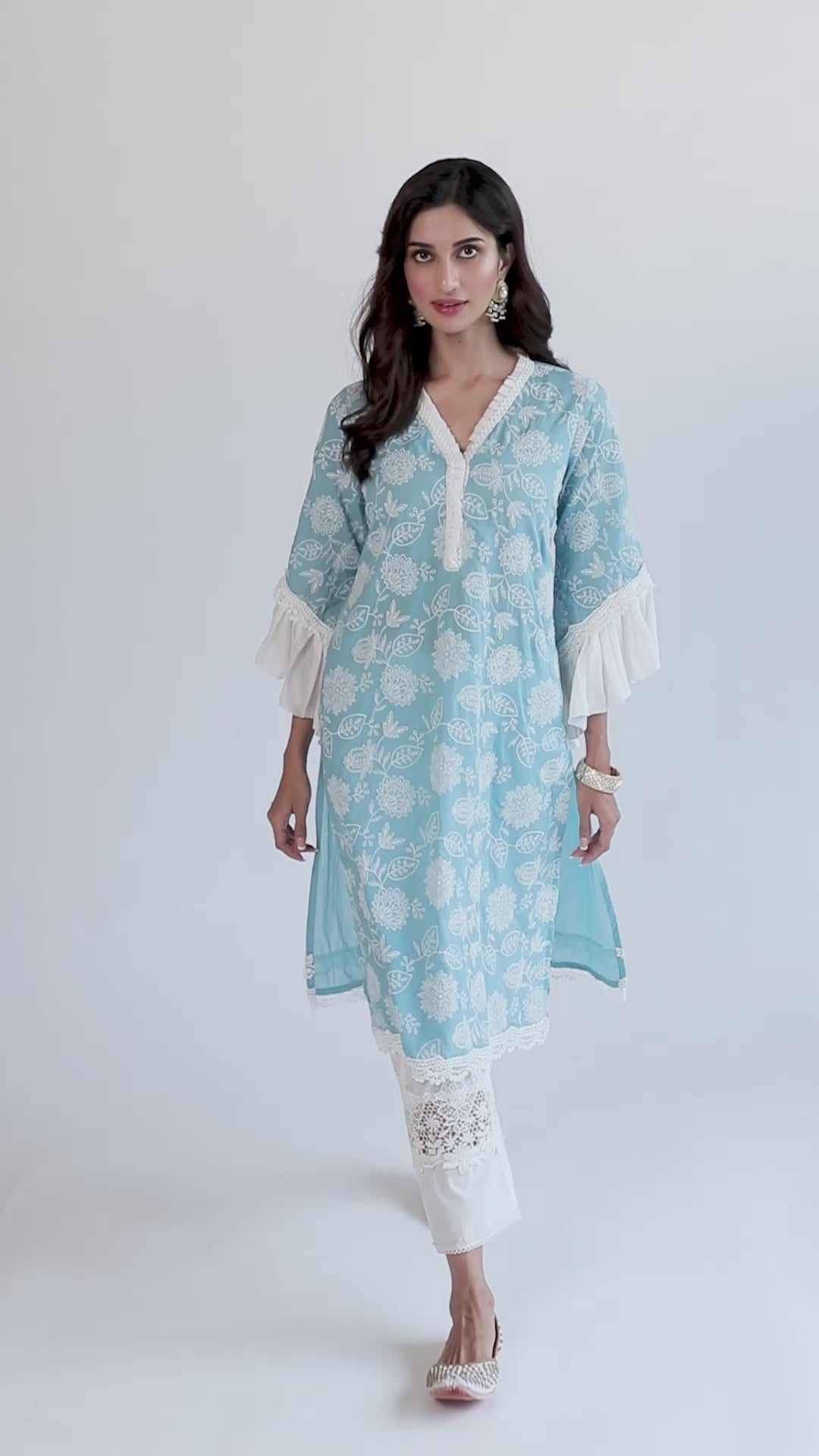 Mulmul Cotton Dreamscape Light Blue Kurta With Two Lace White Palazzo