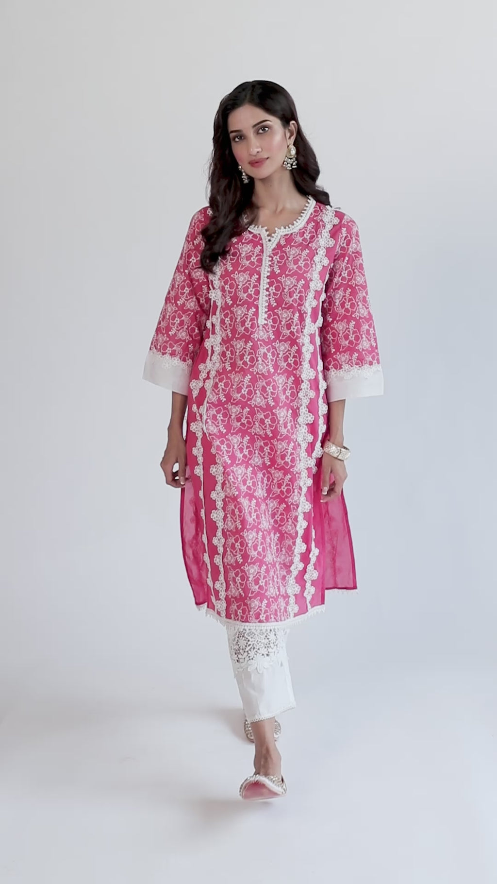 Mulmul Cotton Verlem Pink Kurta With Mulmul Cotton Savri White Pant