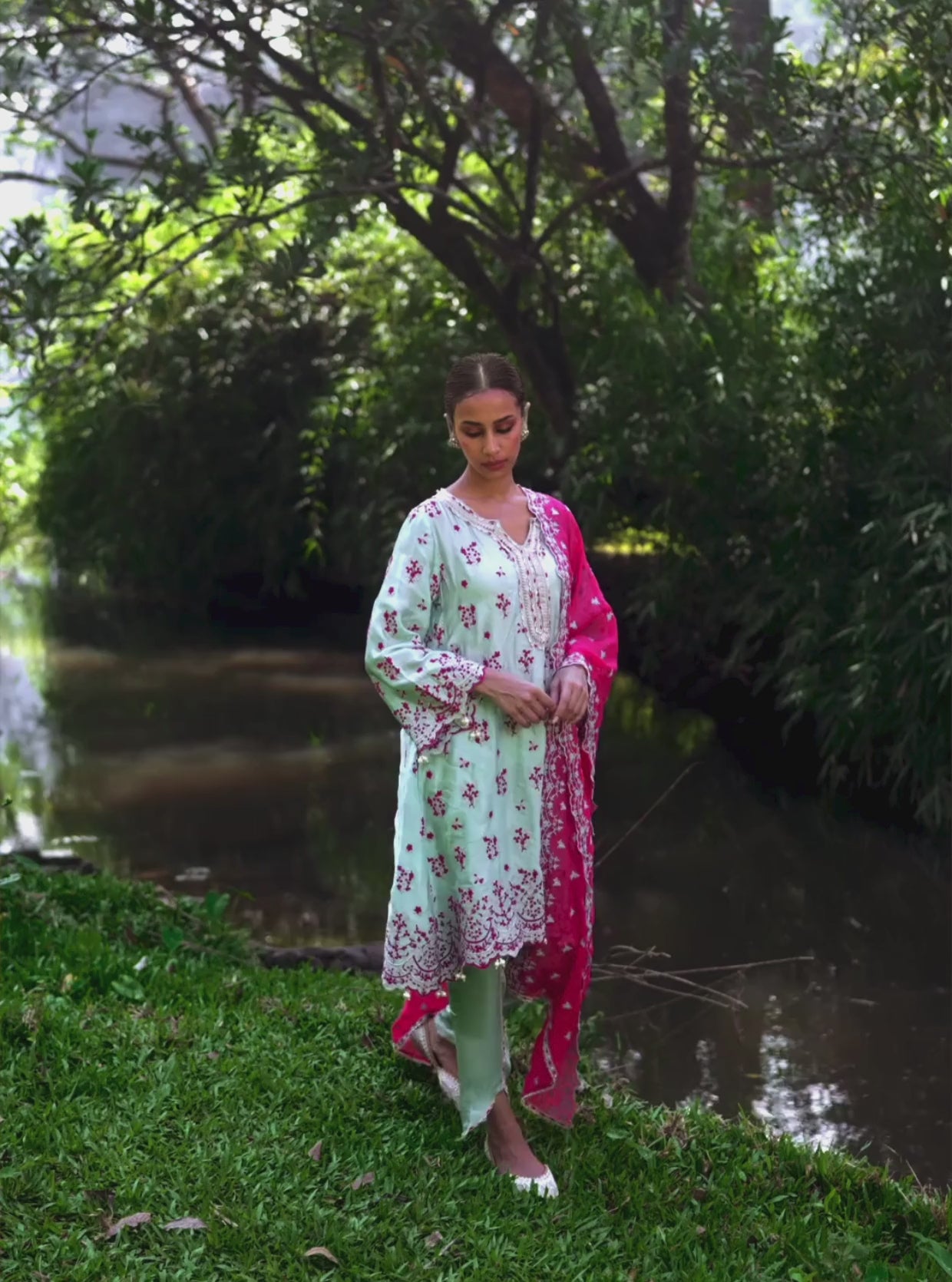 Mulmul Organza Dilruba Lime Green Anarkali Kurta With Mulmul Pima Satin Dilruba Lime Green Pant
