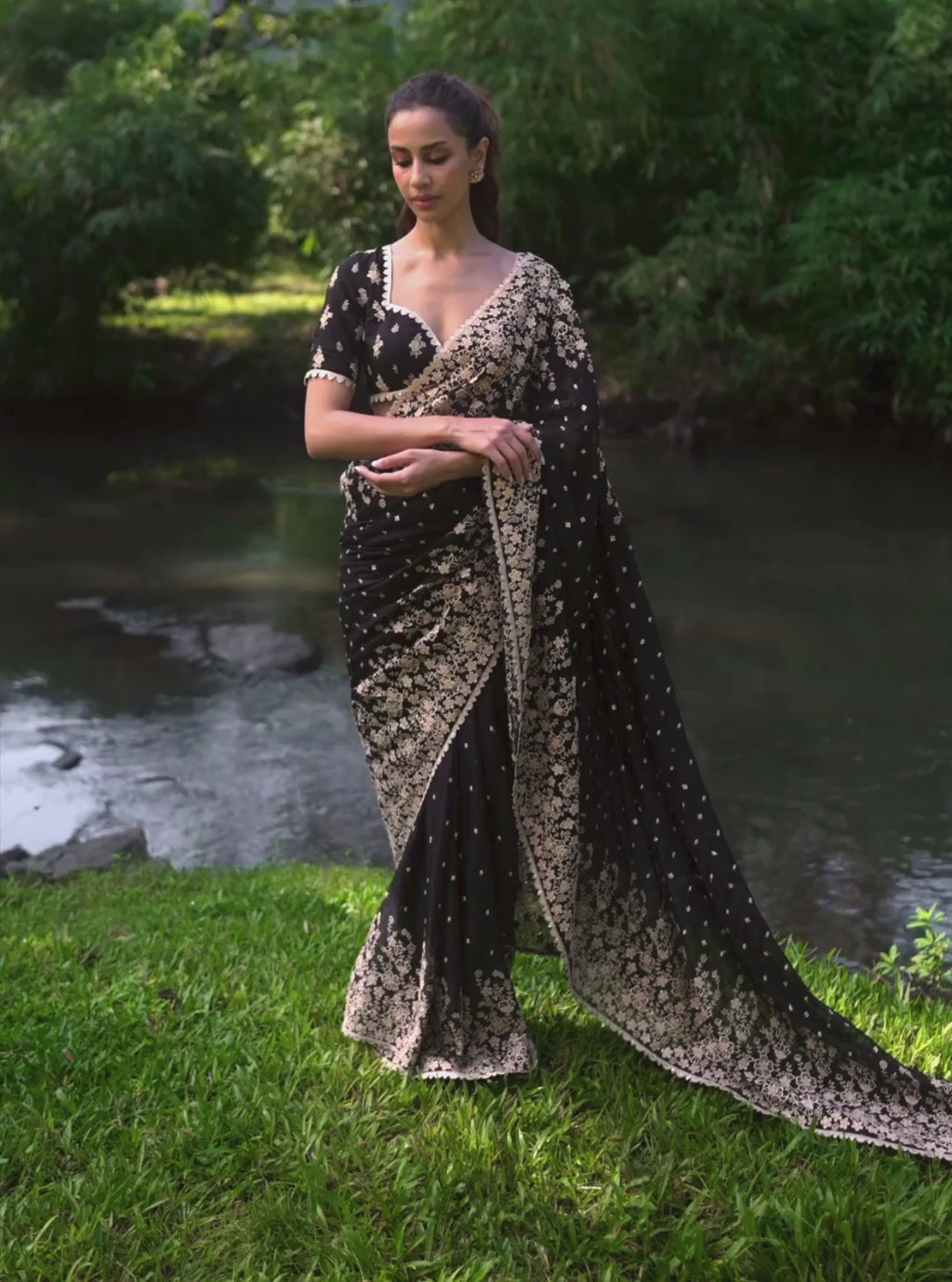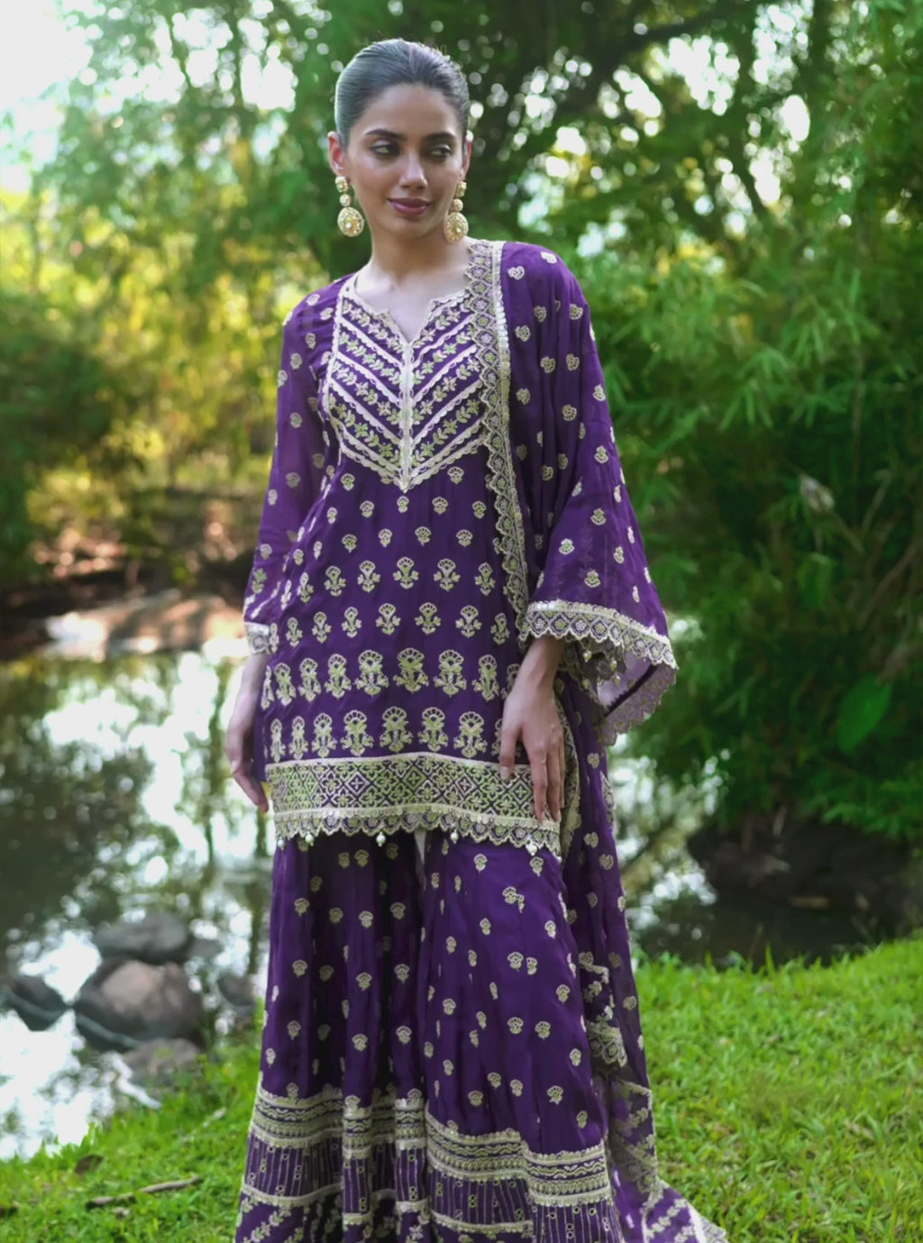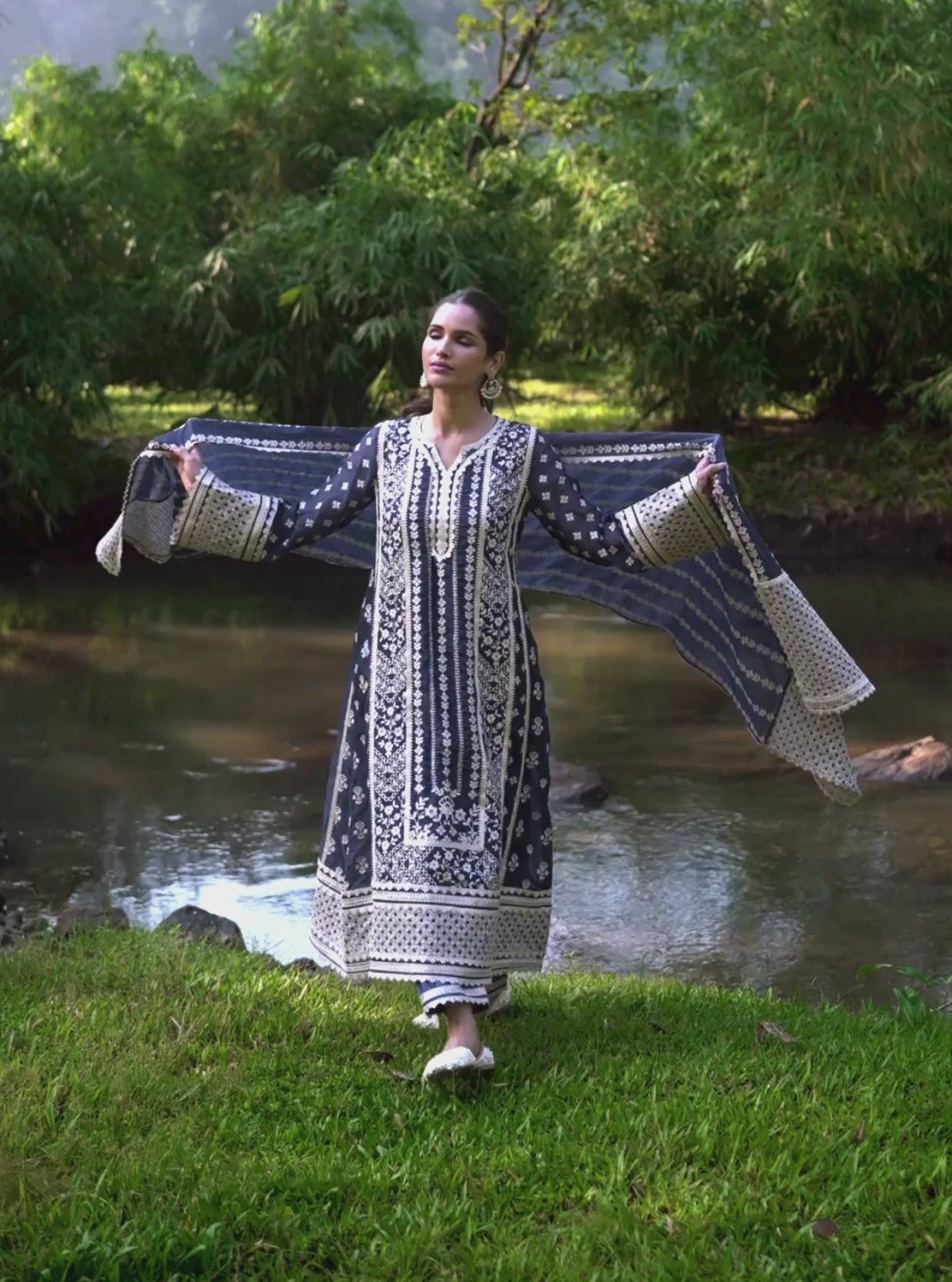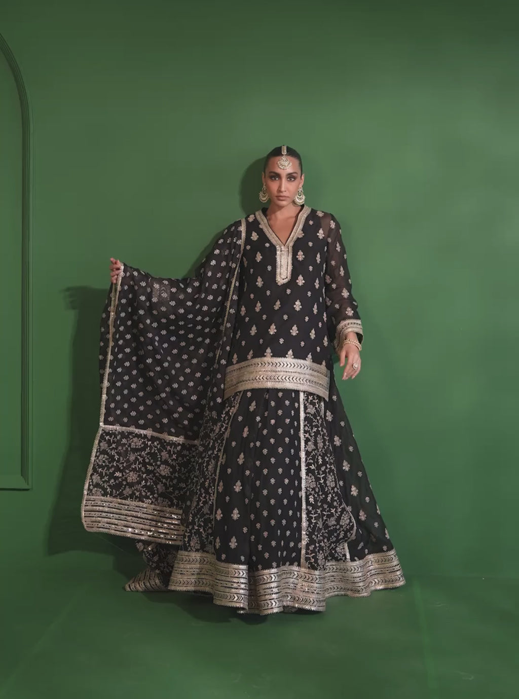 Laila Organza Printed Navy Cape Shrug With Sharara