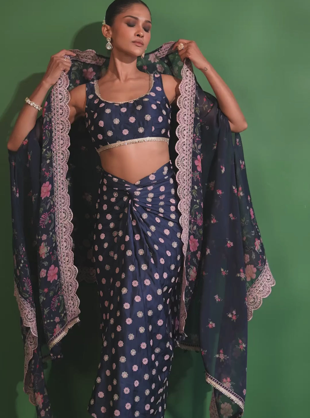 Laila Organza Printed Navy Cape Shrug With Skirt