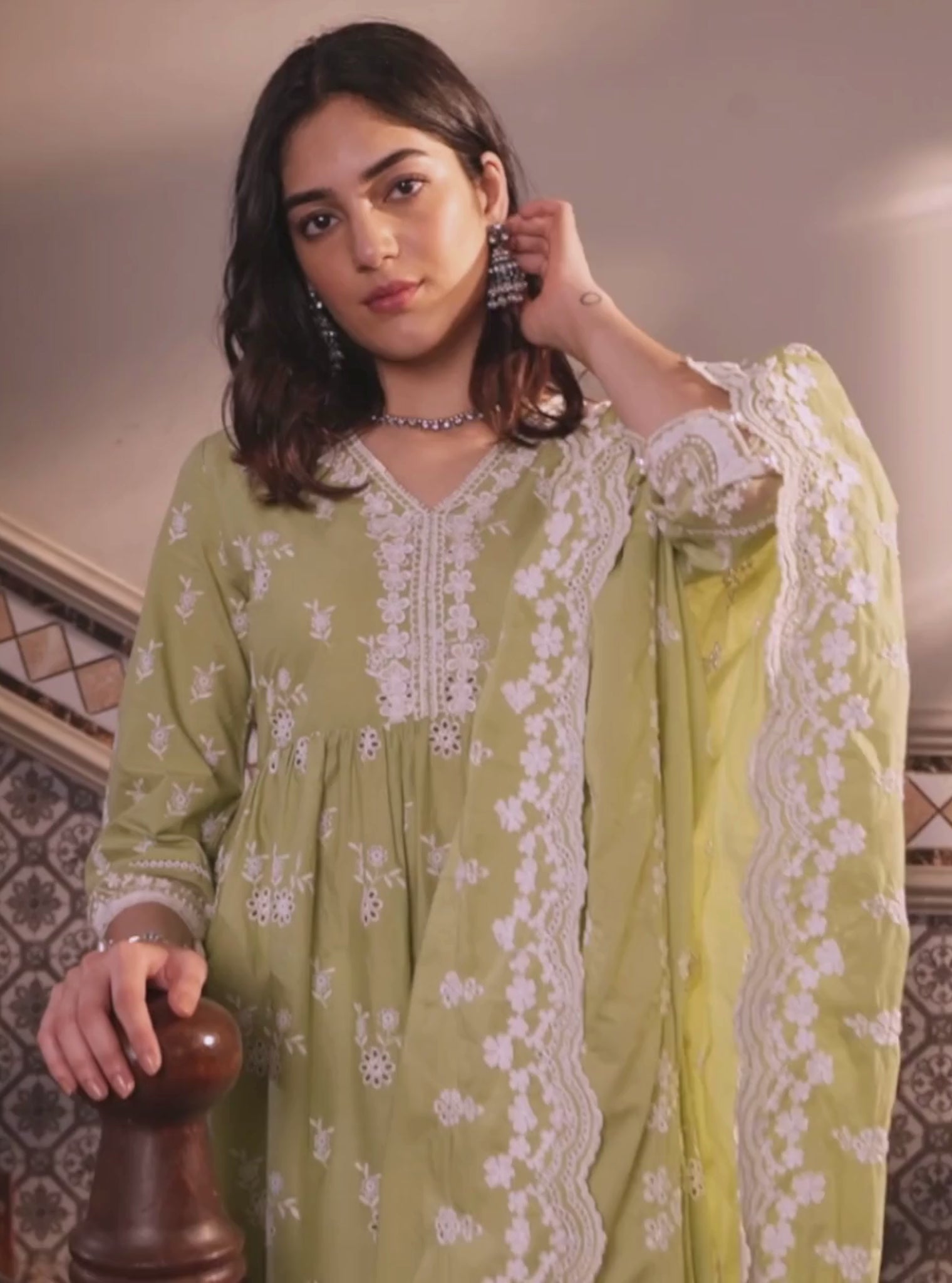 Mulmul Cotton Afarin Light Green Kurta With Mulmul Cotton Organza Scallop Border White Pant