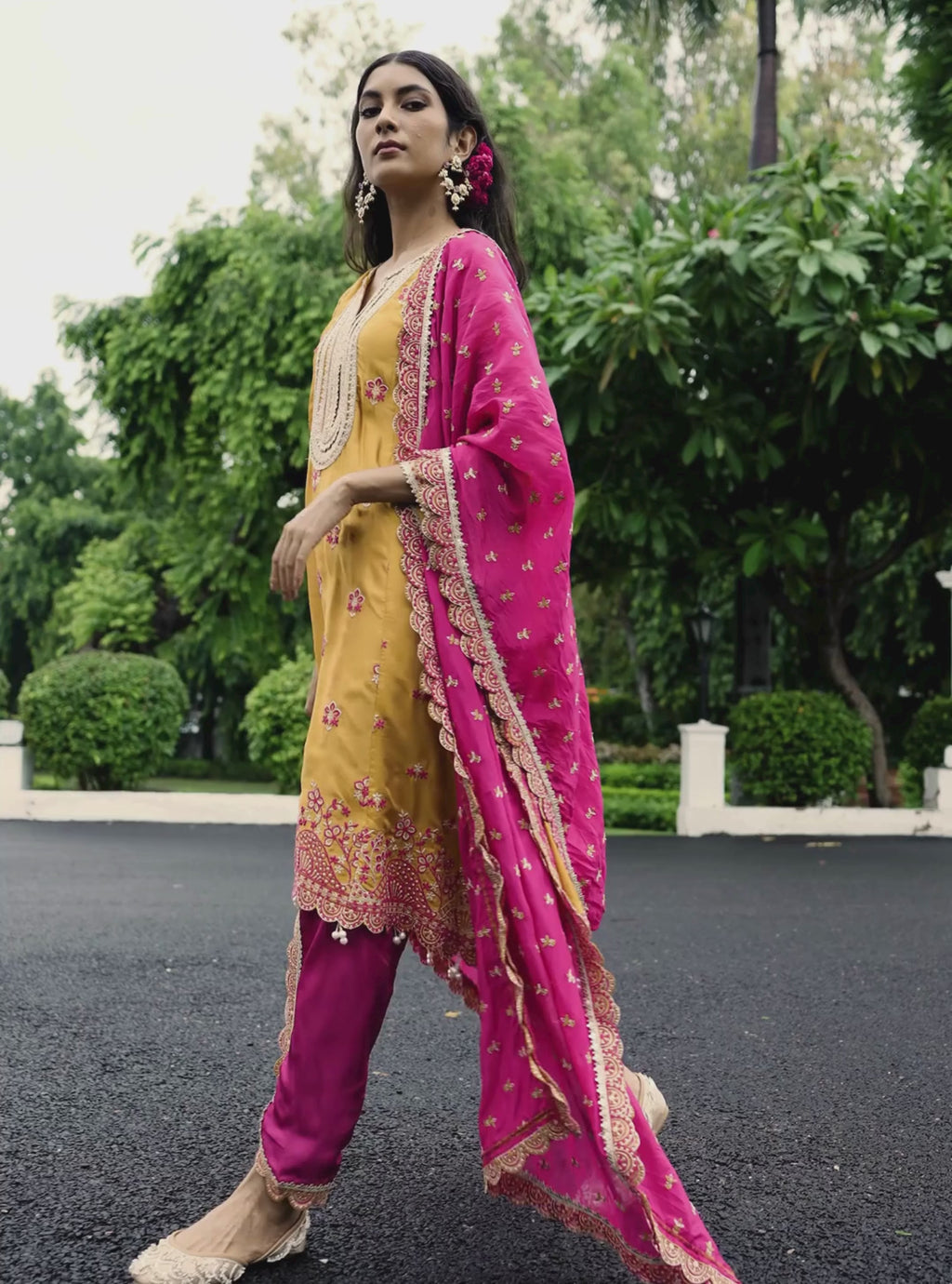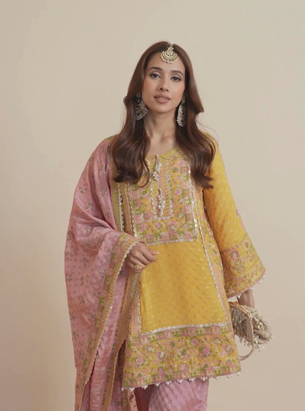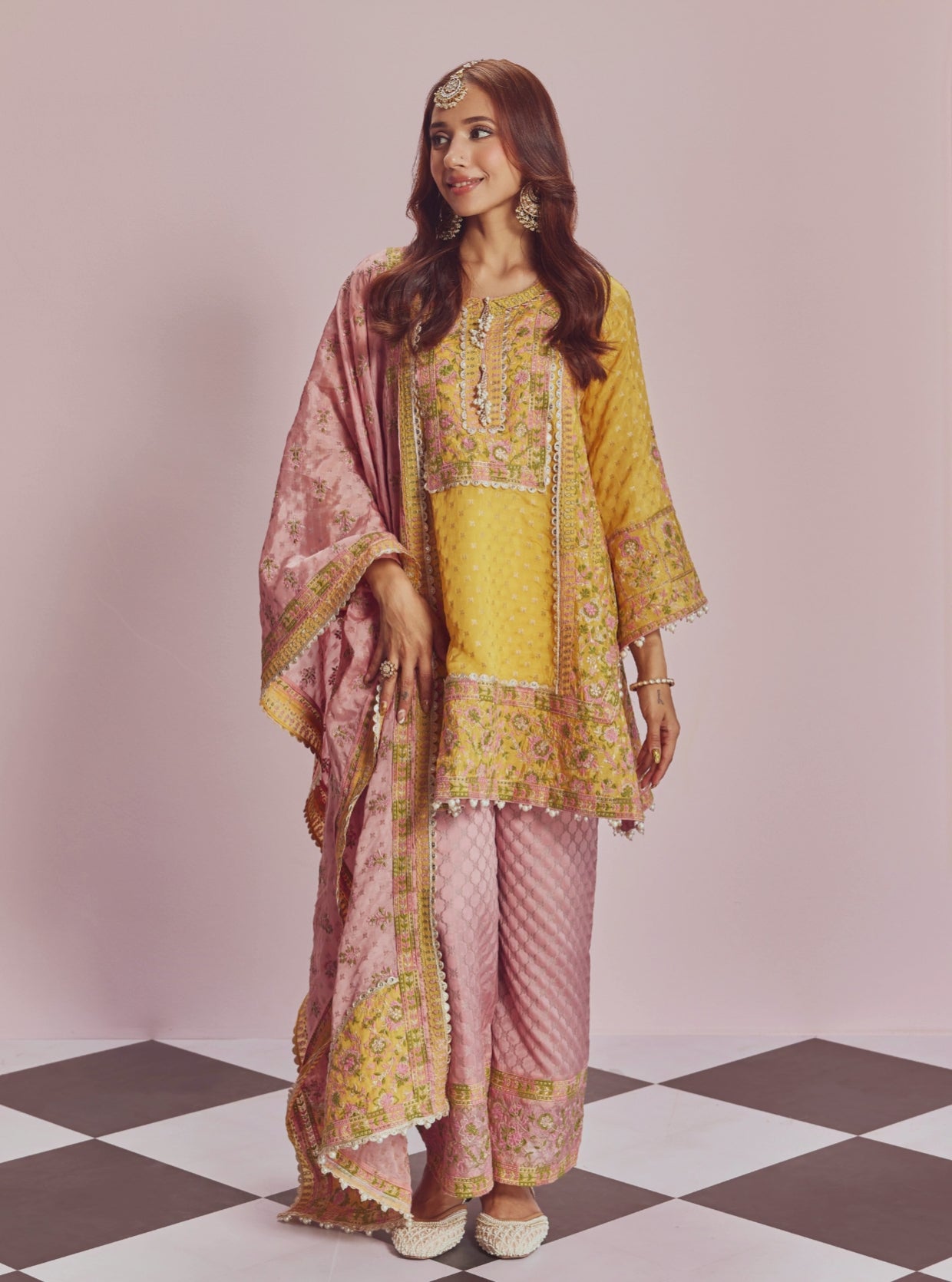 Mangal Banarsi Yellow Kurta With Pink Pant