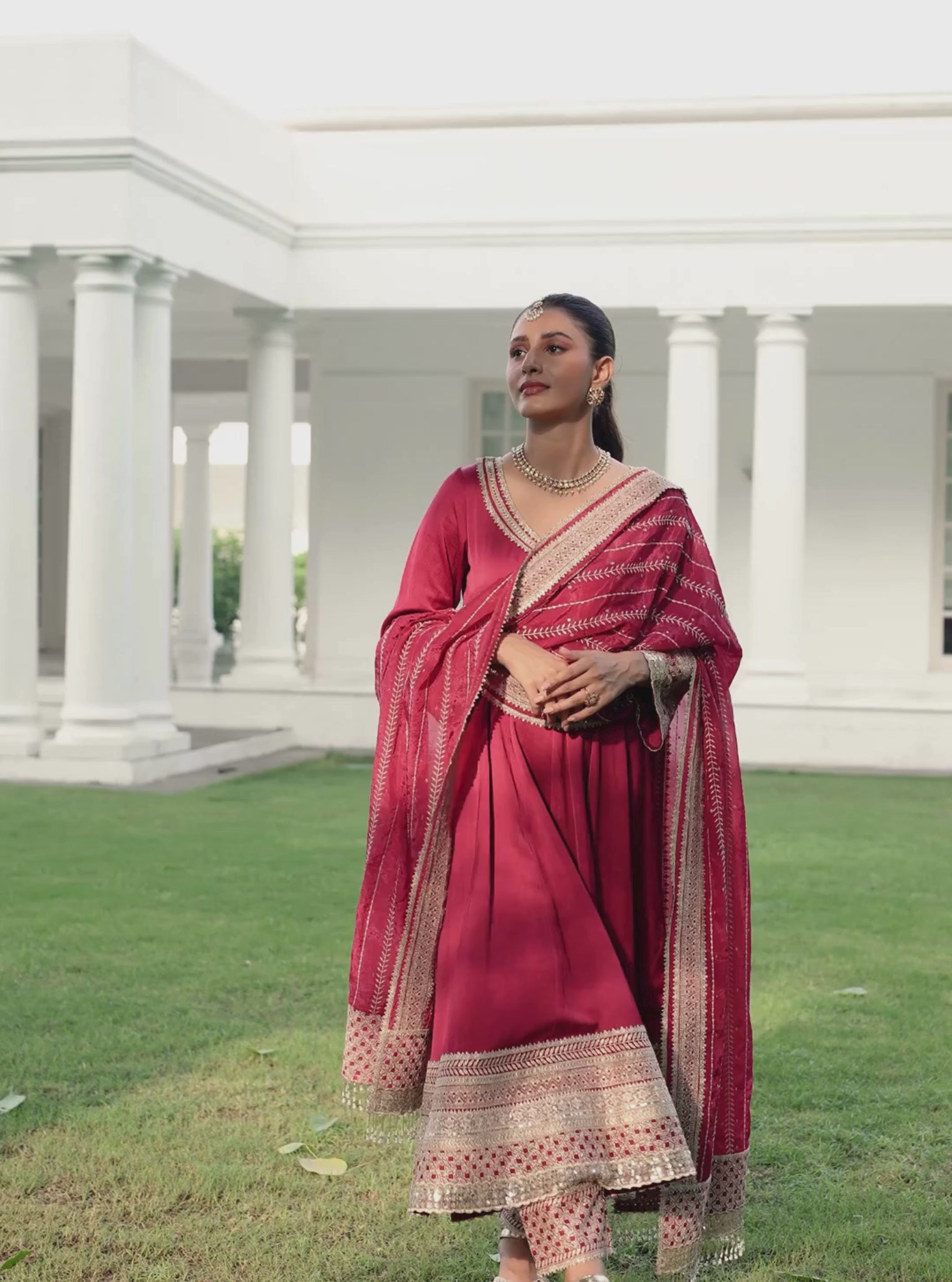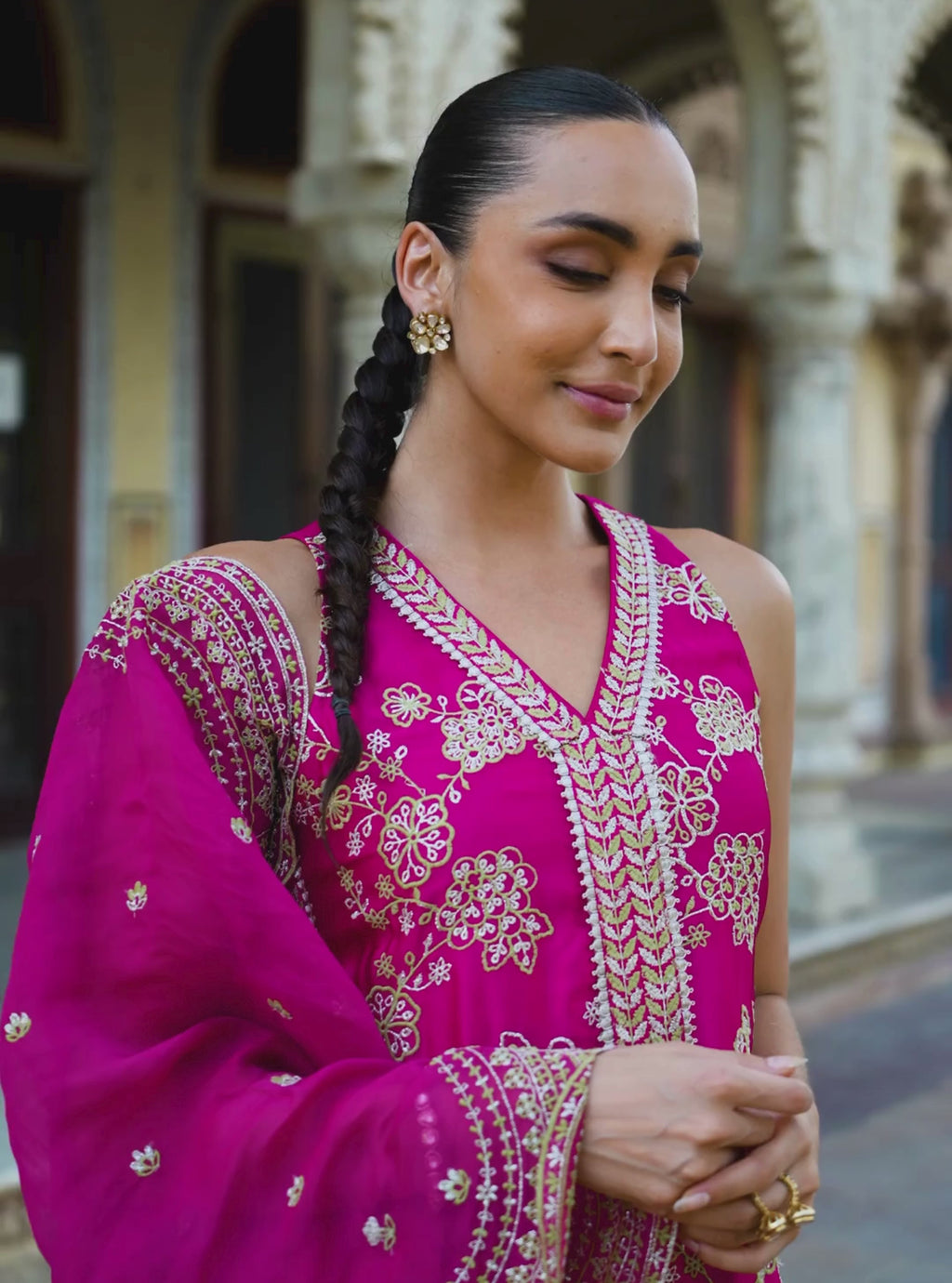Arvini Cupro Satin Fuschia Anarkali Kurta Set