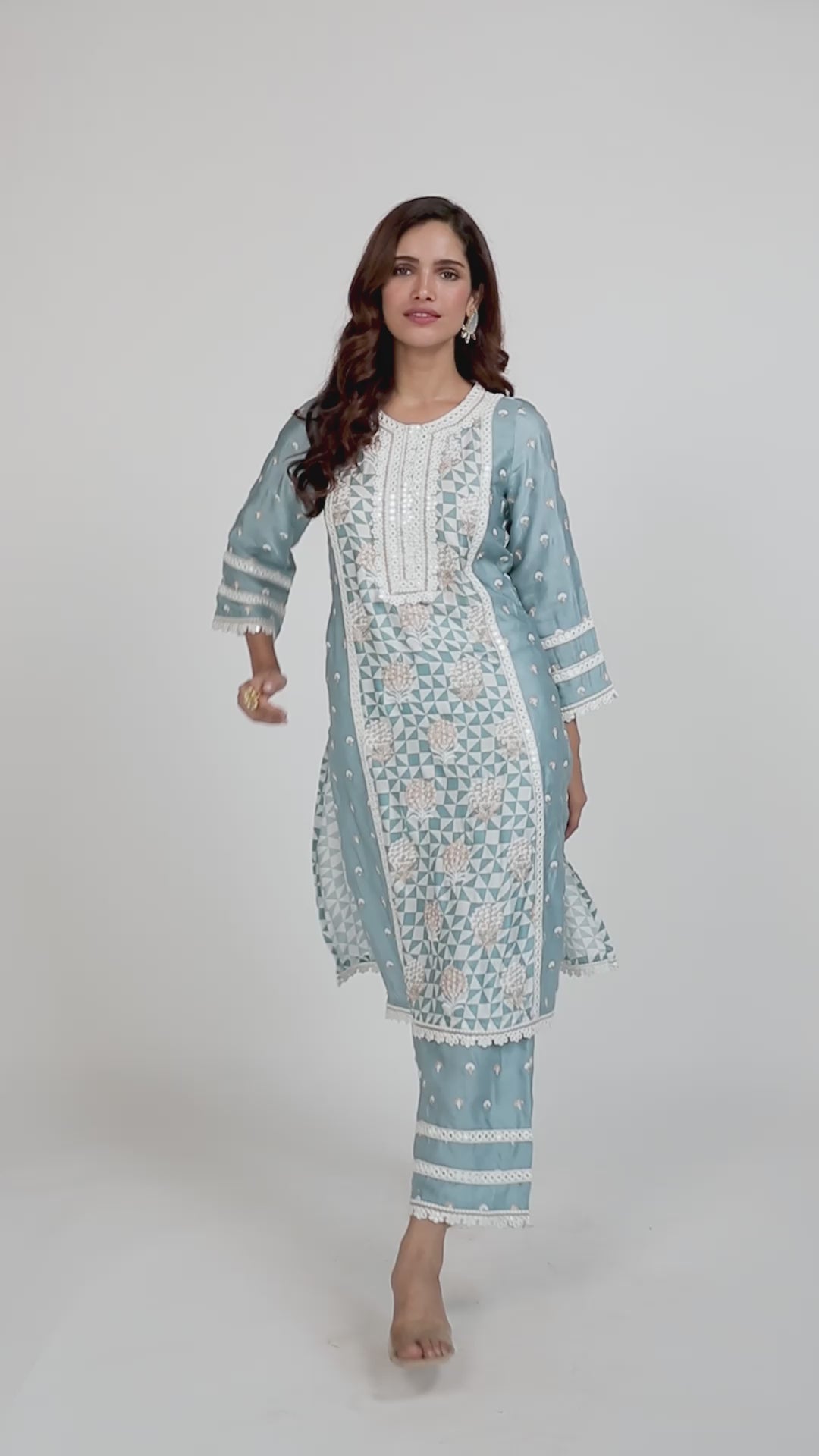 Mulmul Supima Satin Hayes Wedgewood Kurta With Hayes Wedgewood Pant