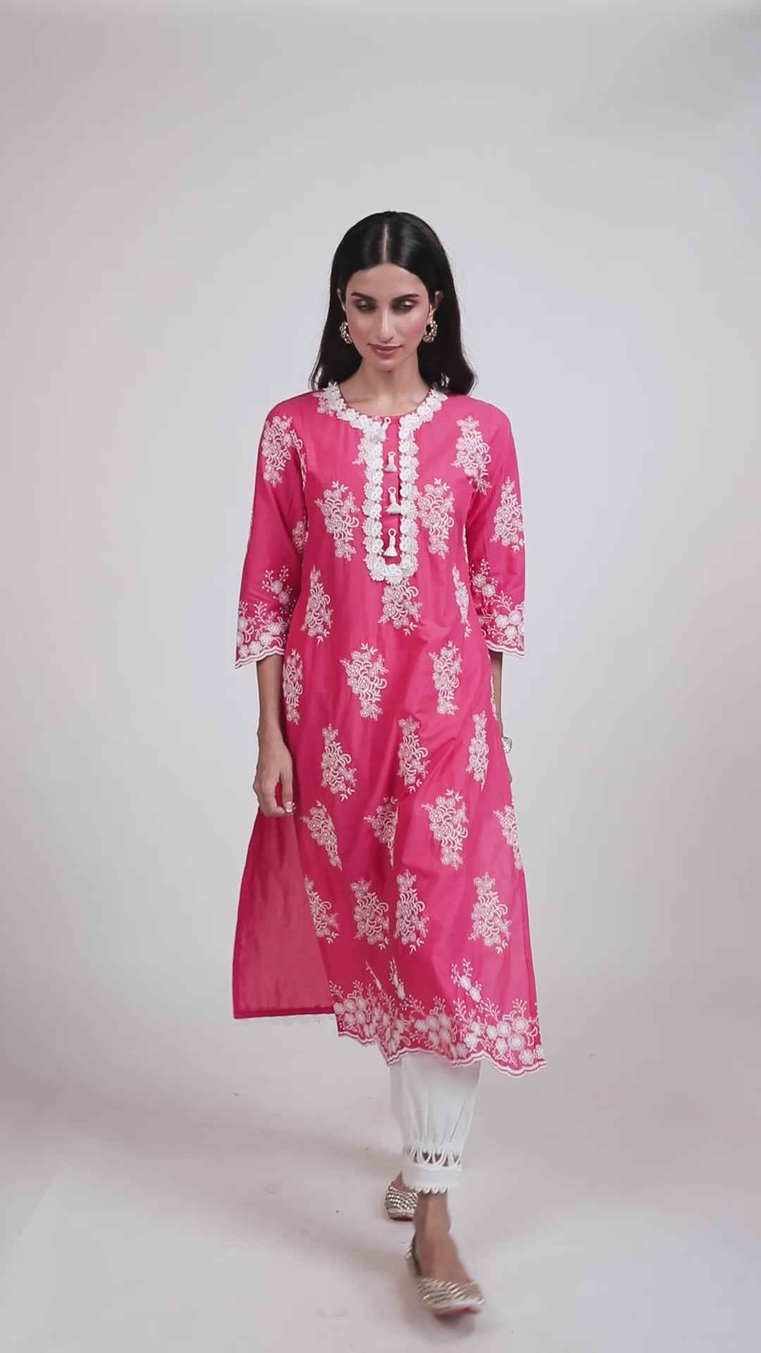 Mulmul Cotton Gene Fuchsia Kurta With Fern Pant White