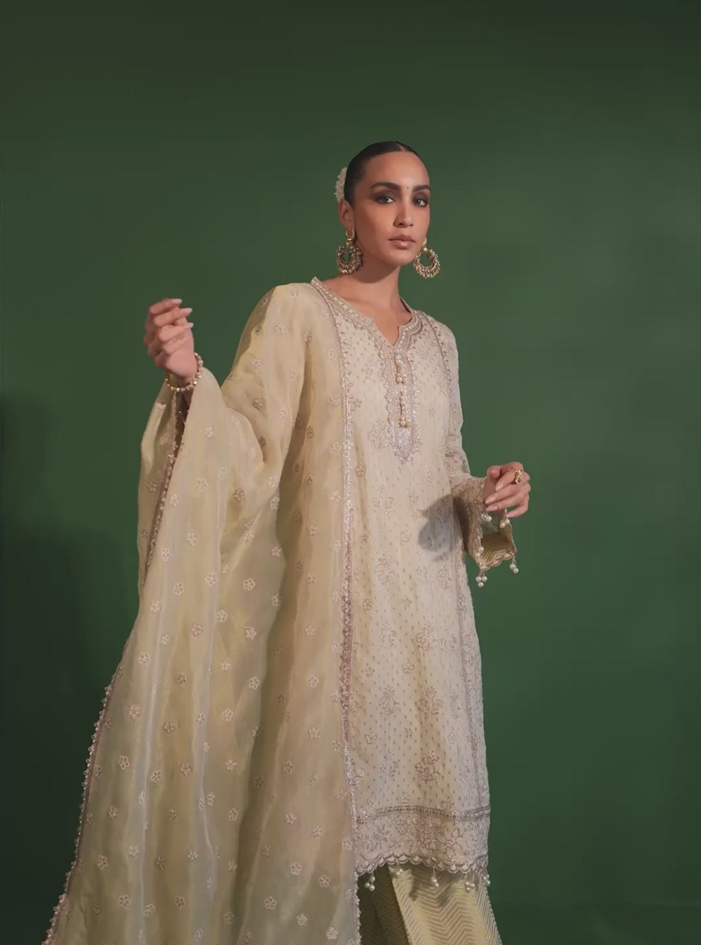Mulmul Banarsi Carey Off White Kurta With Carey Off White Pant