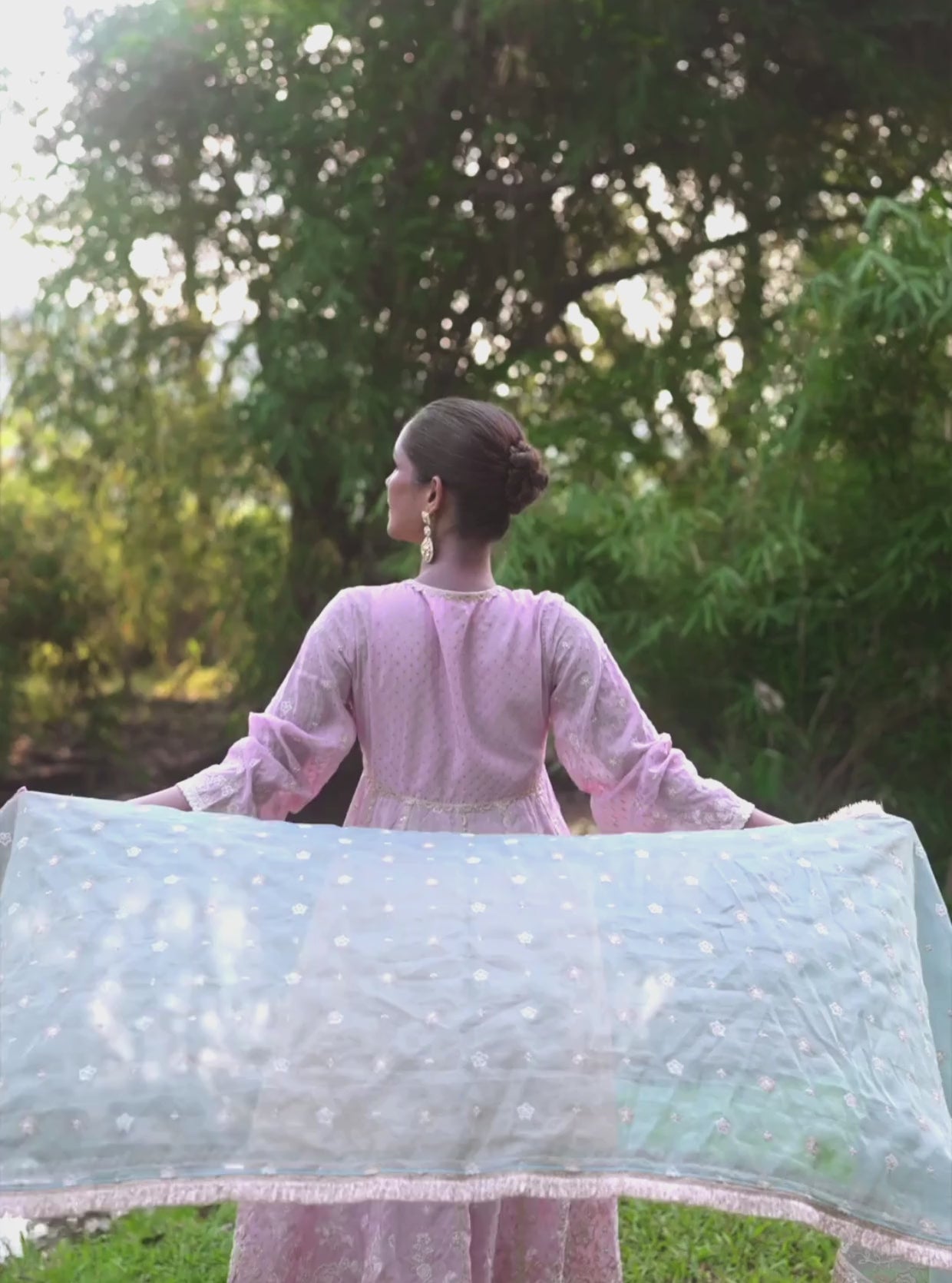 Mulmul Banarsi Eurielle Lilac Anarkali Kurta With Mulmul Pima Satin Eurielle Lilac Pant