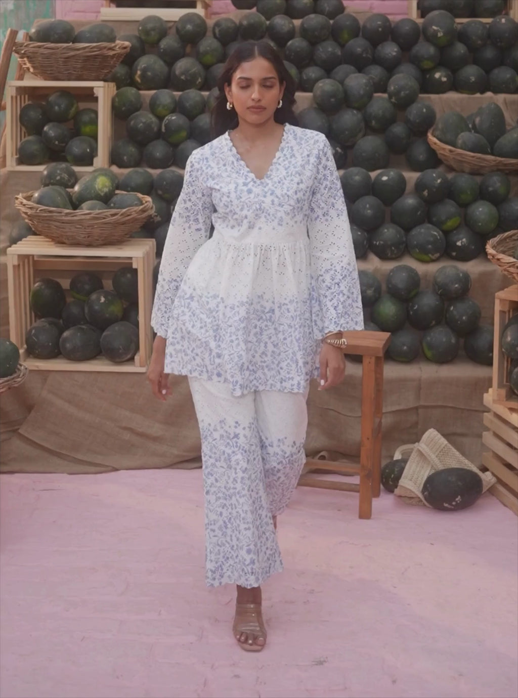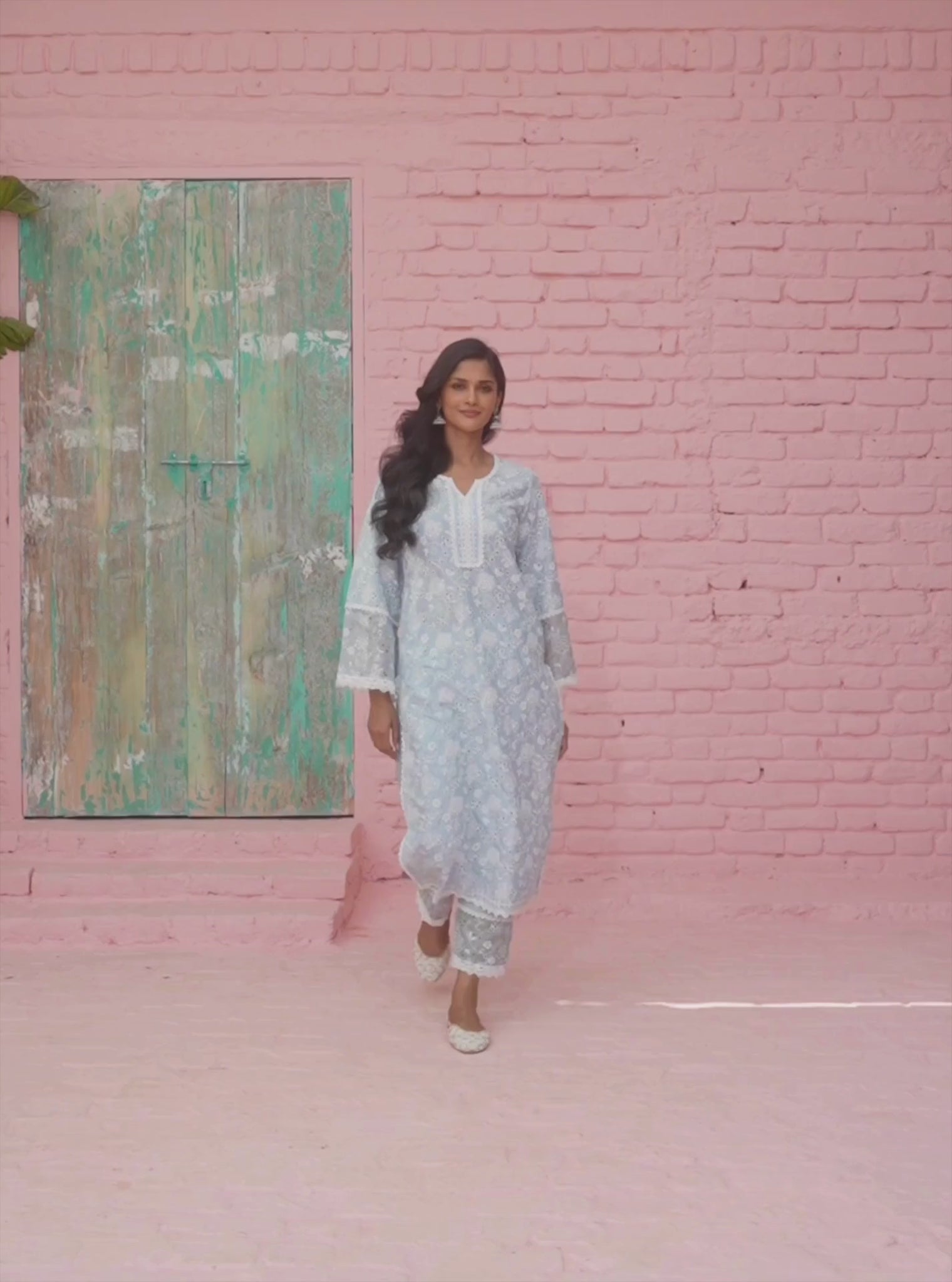 Mulmul Cotton Gauri Light Blue Kurta With Mulmul Cotton Fiza White Pant