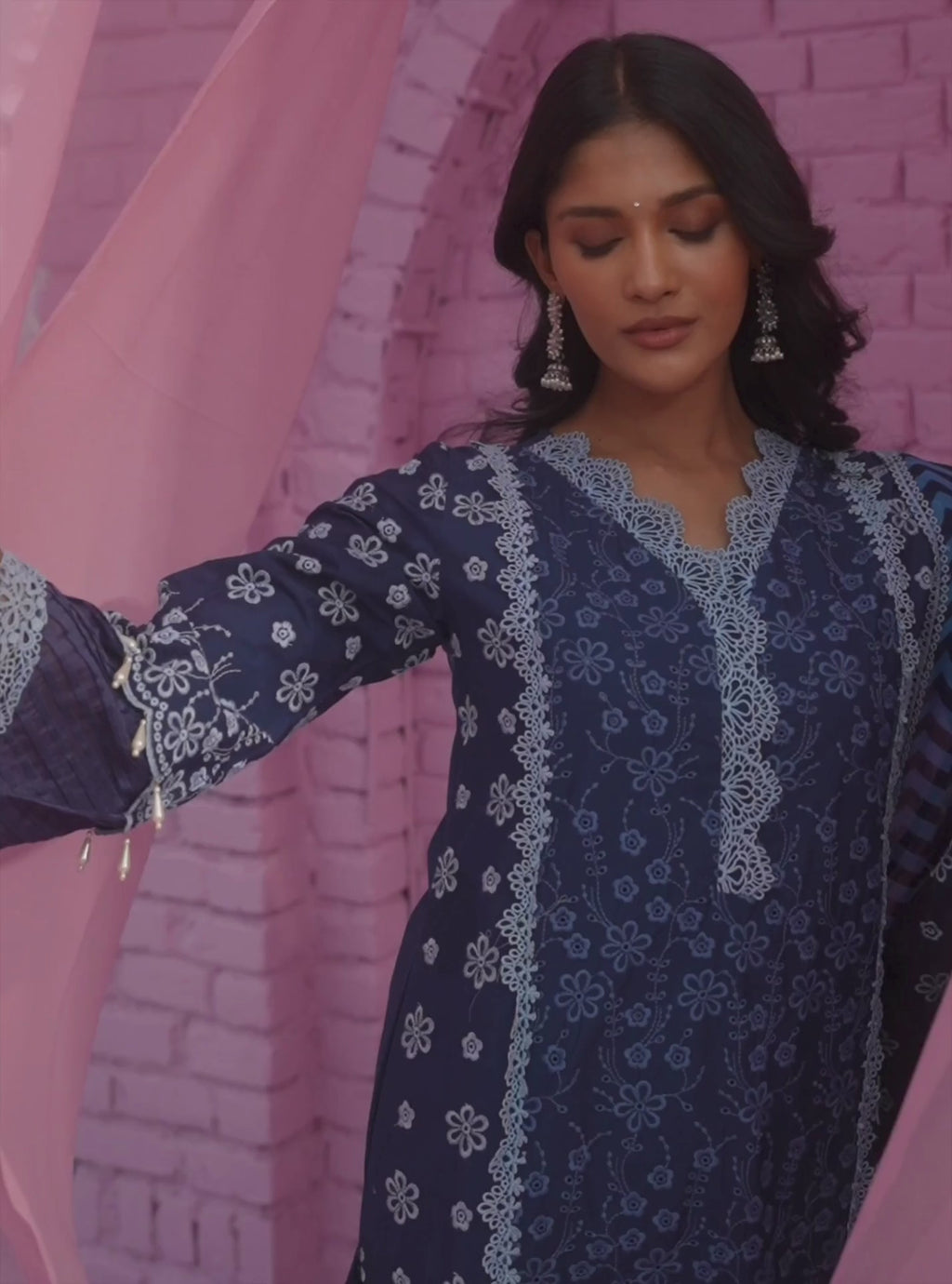 Mulmul Cotton Adhira Navy Kurta With Mulmul Cotton Adhira Navy Pant