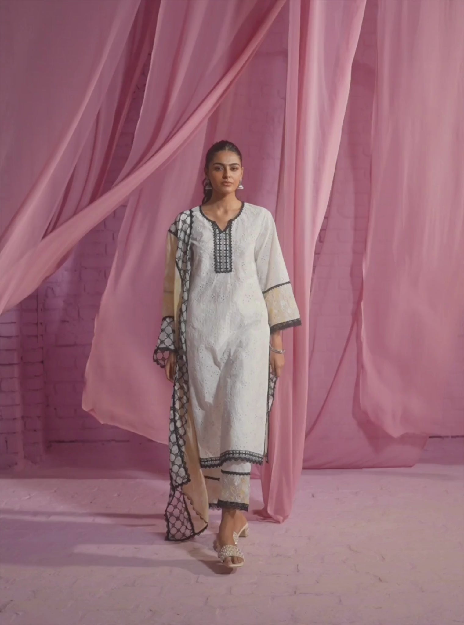Mulmul Organza Cahya Off White Kurta With Mulmul Cotton Cahya Off White Pant