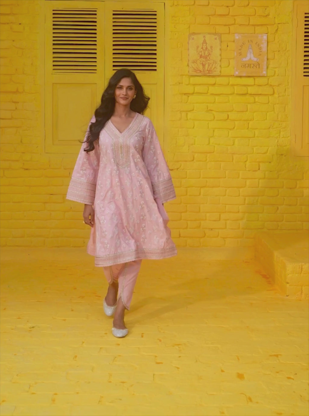 Mulmul Cotton Abria Pink Kurta With Mulmul Cotton Abria Pink Dhoti Pant