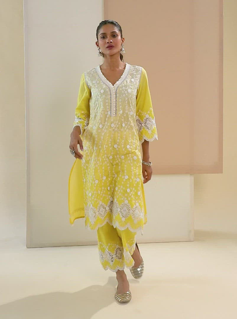 Mulmul Cotton Purna Yellow Kurta With Purna Yellow Palazzo