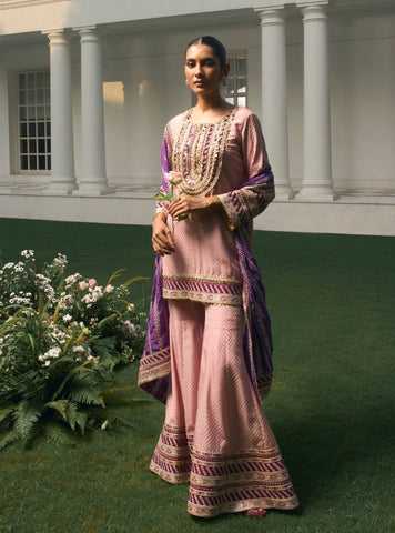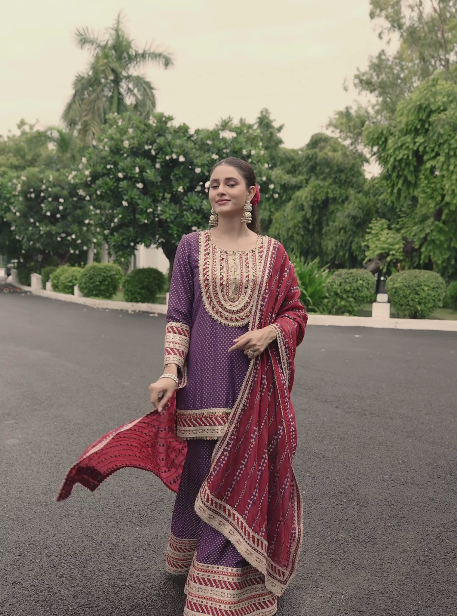 A celebration of vibrant tradition, this Banarasi Eraya kurta set is a vision of festive elegance. The straight short kurta, crafted in Banarasi colored polka dot fabric, pairs beautifully with a matching sharara in the same rich weave, creating a harmonious play of texture and color. Paired with a uxurious red viscose glass organza Eraya dupatta, bordered with fine detailing, adds a regal contrast to the ensemble.