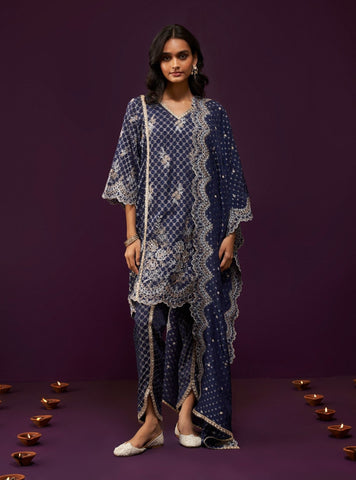 Step into a world of refined elegance with this midnight blue kurta set, a flawless fusion of refined elegance and contemporary flair. This ensemble stands out for its intricate embroidery and unique silhoutte, making it a perfect choice for festive occasions or celebratory evenings. The kurta is adorned with an intricate jaal pattern that creates a striking geometric effect, subtly offset by delicate floral motifs in shades of silver and ivory. The meticulously embroidered details draw attention to the rich texture of the fabric, enhancing its natural sheen. The V-neckline is bordered with fine gotta work. The kurta's hem and sleeves are finished with beautifully scalloped edges, accentuated by intricate threadwork.
