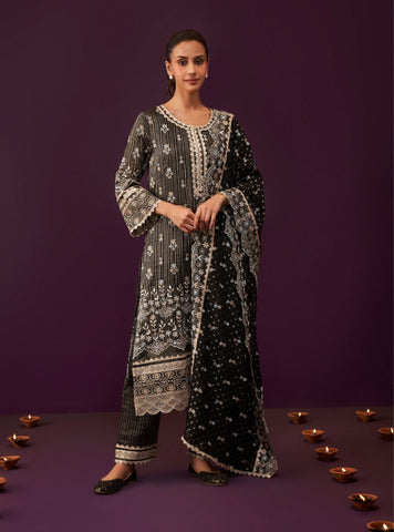 The accompanying straight-fit pants feature subtle yet impactful embroidery around the cuffs. The dupatta is a masterpiece in itself. It is embellished with scattered floral embroidery, bordered with wide scalloped edges that are intricately detailed with zari and threadwork.