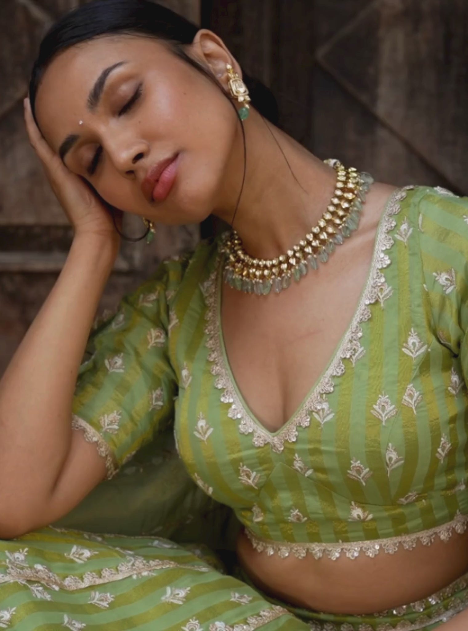 Mulmul Banarsi Sindhuri Green Lehenga