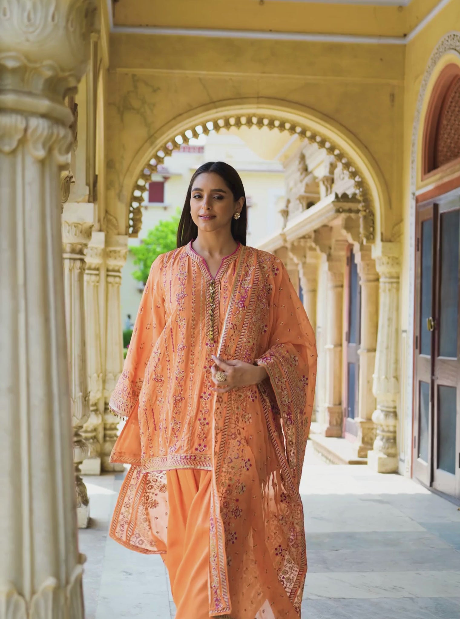 Understated and luminous, the Pralika Kurta Set in Orange brings together soft pastel tones and intricate embroidery. Crafted in fluid Bemberg satin, the kurta features vertical vines of multicolour thread embroidery with hints of cutdana. The striped neckline is highlighted with mirror buttons and a flattering slit, while the bell sleeves are finished with floral borders, striped trims, and dangling pearls. The matching satin salwar features embroidery on the cuffs for a coordinated yet relaxed finish. Pair it with its lightweight organza dupatta to complete your Rakhi-ready ensemble.