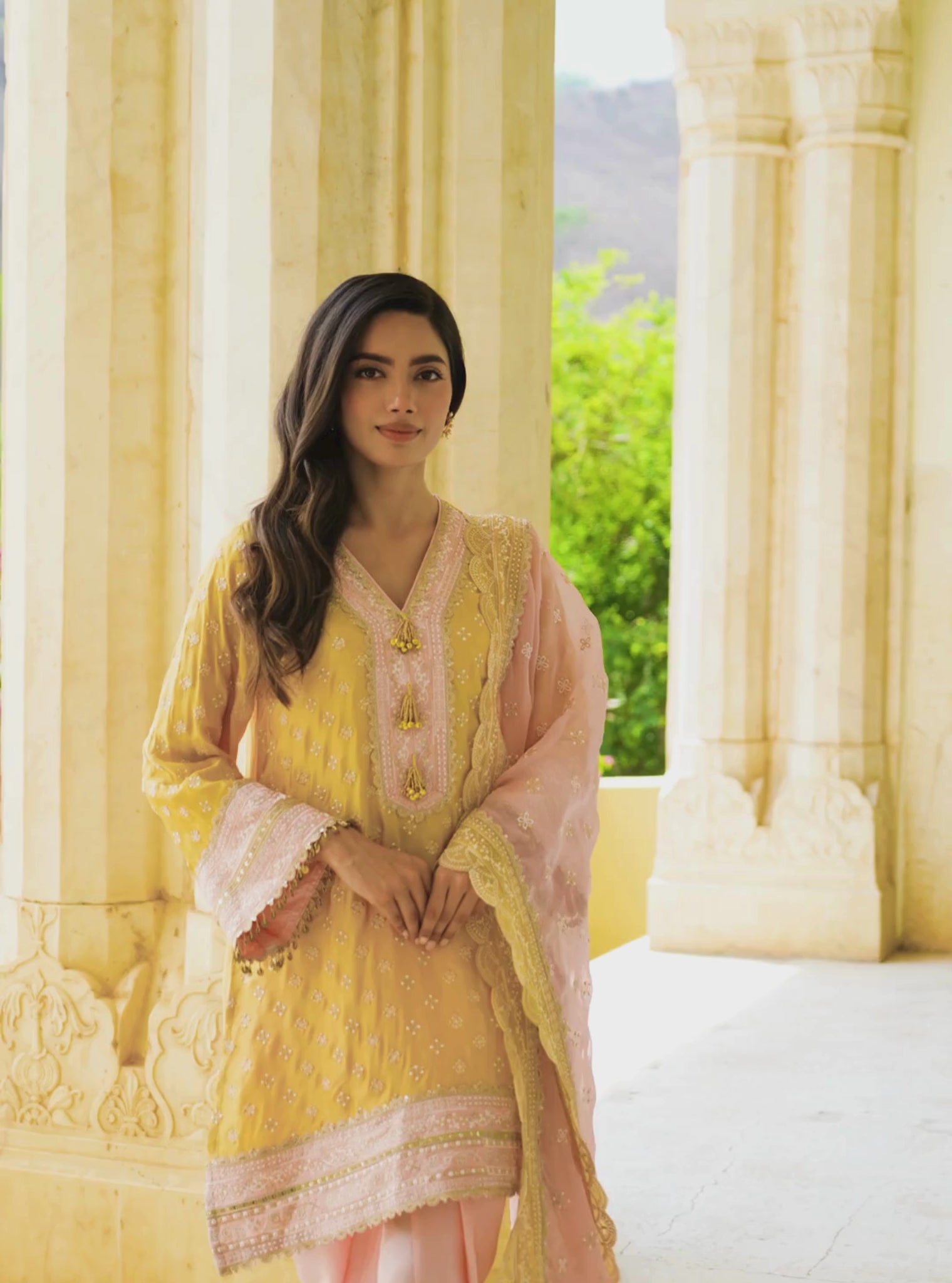 The Survani Kurta Set in mustard channels vintage romance with a festive flair. Cut in a luxe Bemberg satin, the kurta is adorned with delicate floral embroidery. The V-neckline features heavy embroidery and playful dori tie-ups with multi-tier tassels and ghungroos that add movement with every step. The sleeves and hem are framed with gota scallops, and intricate lacework, while the pink dhoti-style pants soften the look with a graceful drape. Finished with an airy blush organza dupatta; scalloped, gold-trimmed; this one’s a rakhi-ready dream dipped in sunshine and shimmer.