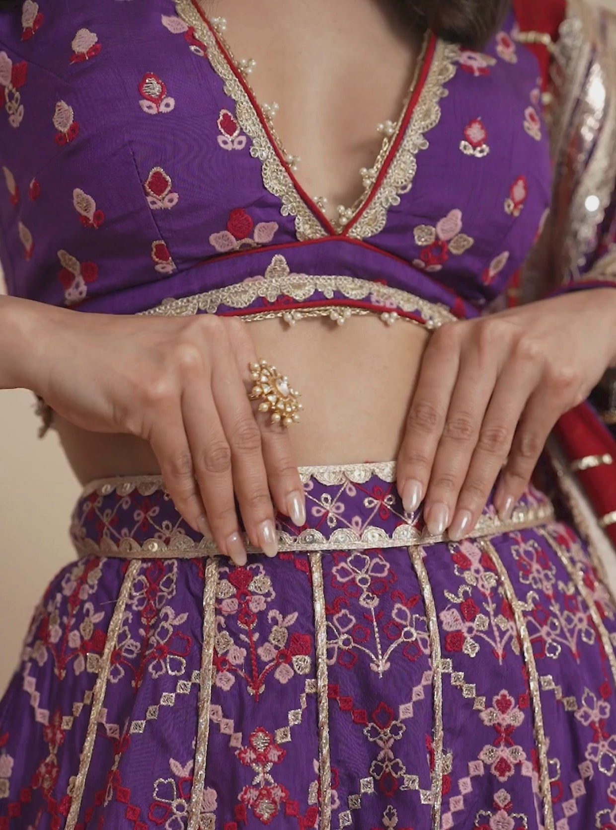 Step into the spotlight in this show-stopping purple lehenga, a celebration of color, culture, and detailing. Adorned with intricate gota and bandhani-inspired embroidery, the voluminous skirt features traditional motifs brought to life through rich hues and detailed embroidery. The striking red dupatta adds a burst of tradition, beautifully balancing the rich purple lehenga.