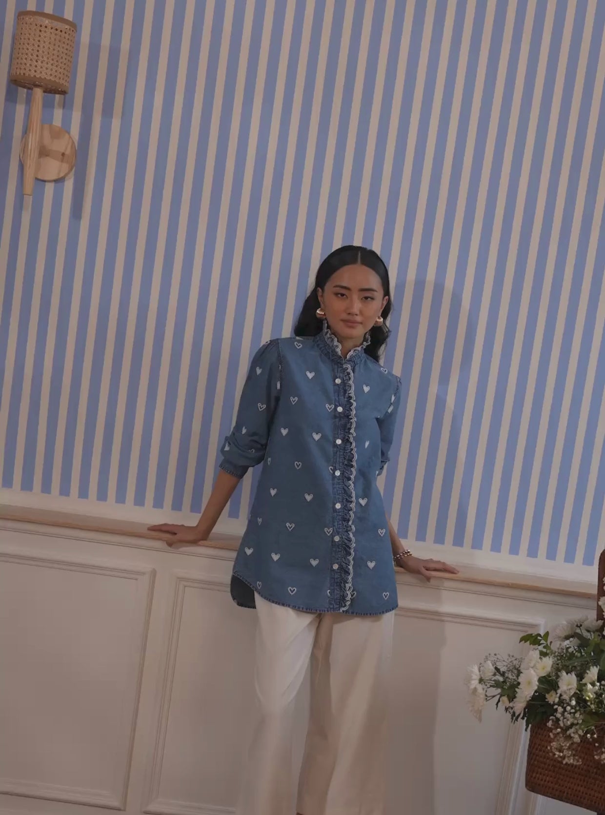 Add a playful twist to your wardrobe with this charming heart-embroidered denim shirt, The romantic silhouette is elevated with a ruffled high neckline and matching ruffle detailing along the placket. Perfectly blending vintage-inspired romance with modern ease, this shirt is an ideal pick for brunch dates, weekend strolls, or casual Fridays.