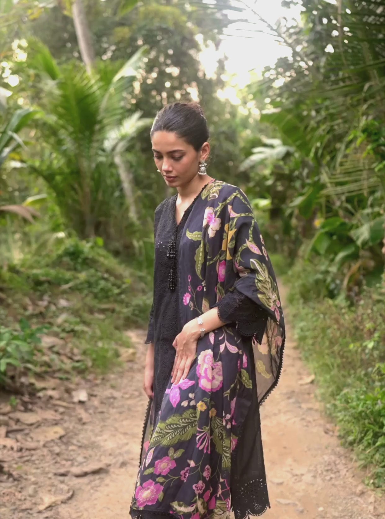 The look is completed with a matching black organza dupatta, featuring tonal floral patterns that add depth and dimension. The interplay of textures and the all-black palette make this ensemble a versatile choice for festive evenings, cocktail gatherings, or intimate celebrations, exuding an aura of understated glamour.