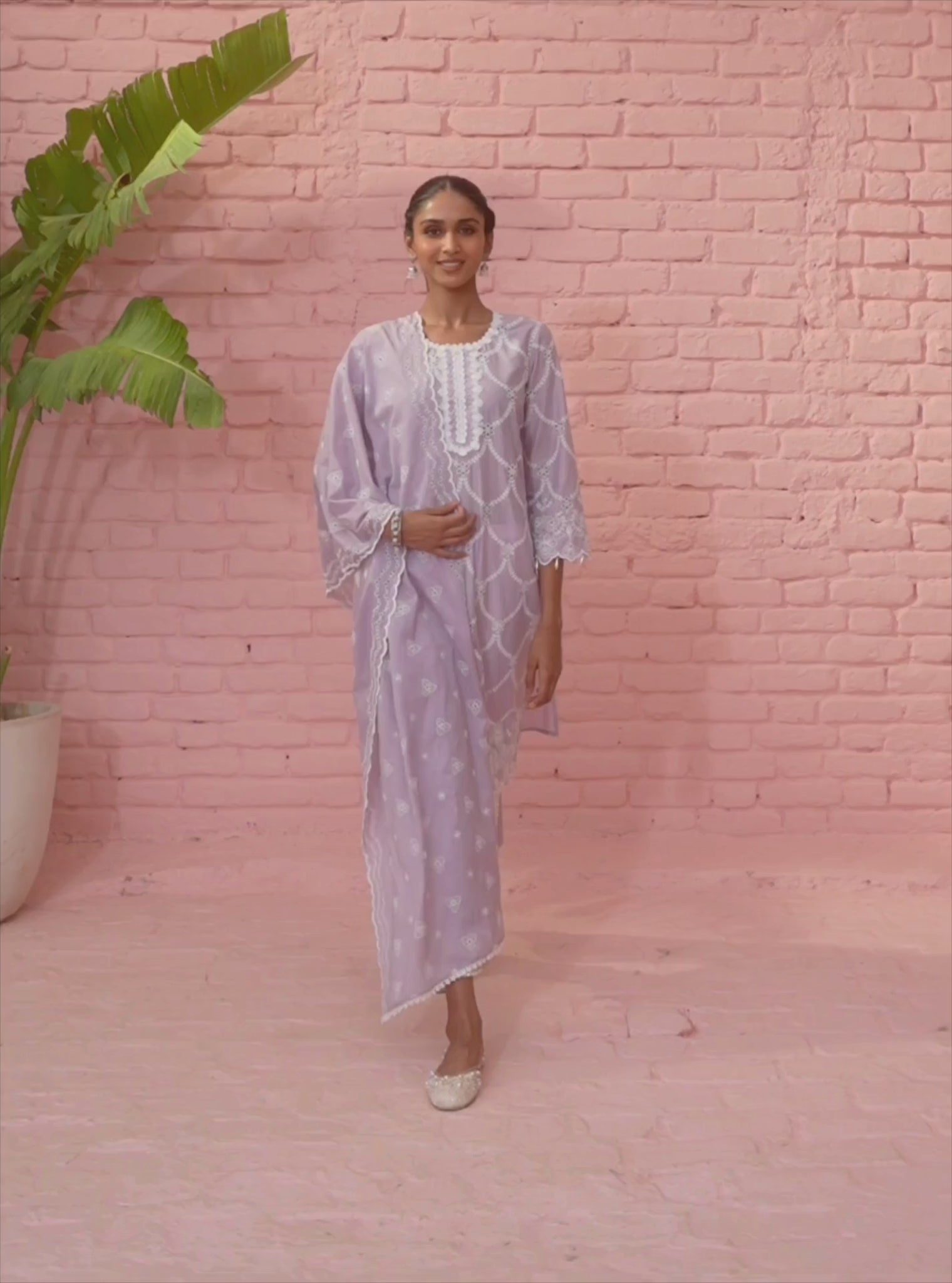 Pair the kurta with the matching lilac dupatta, featuring scalloped edges and delicate embroidery all over.