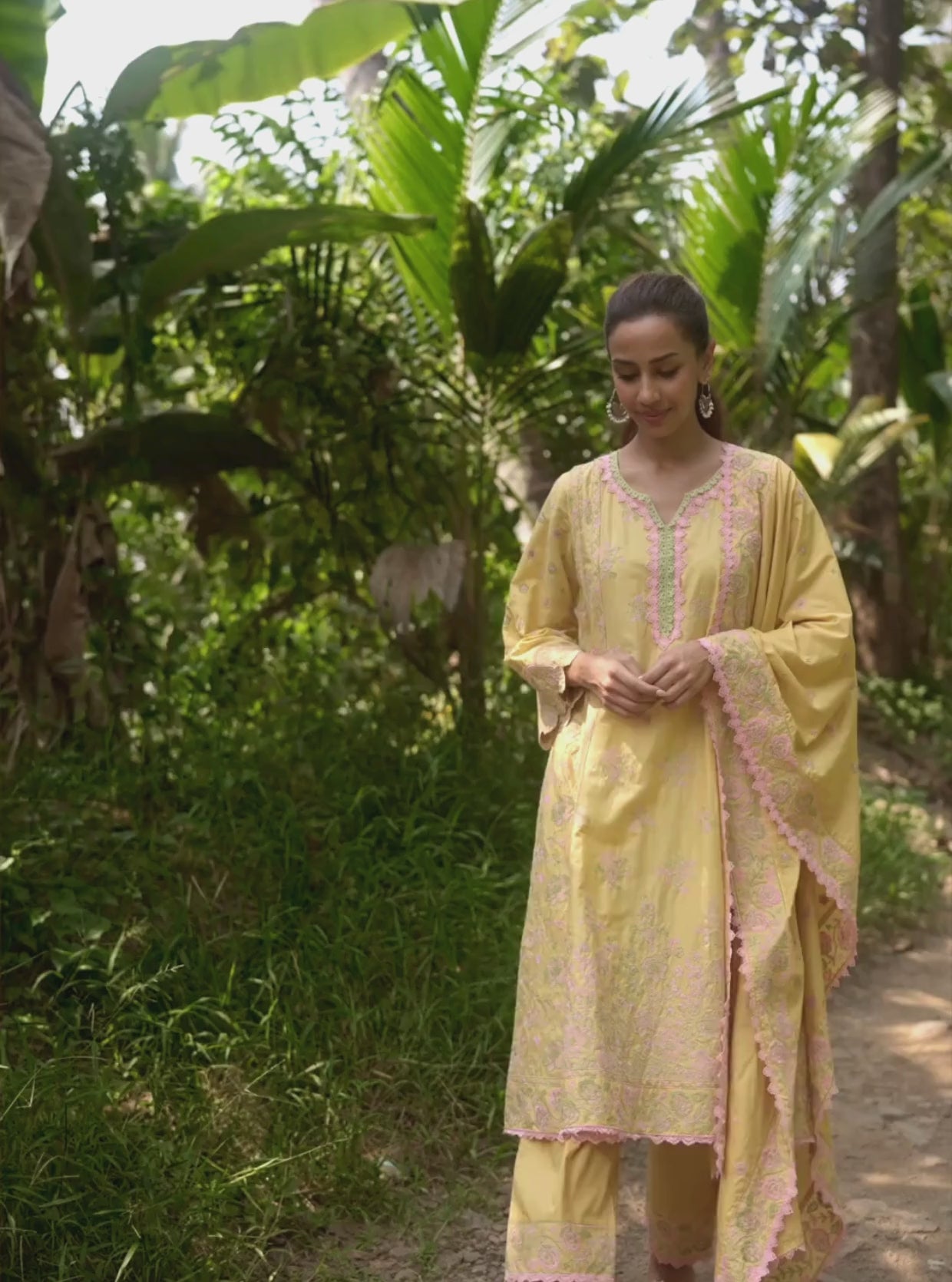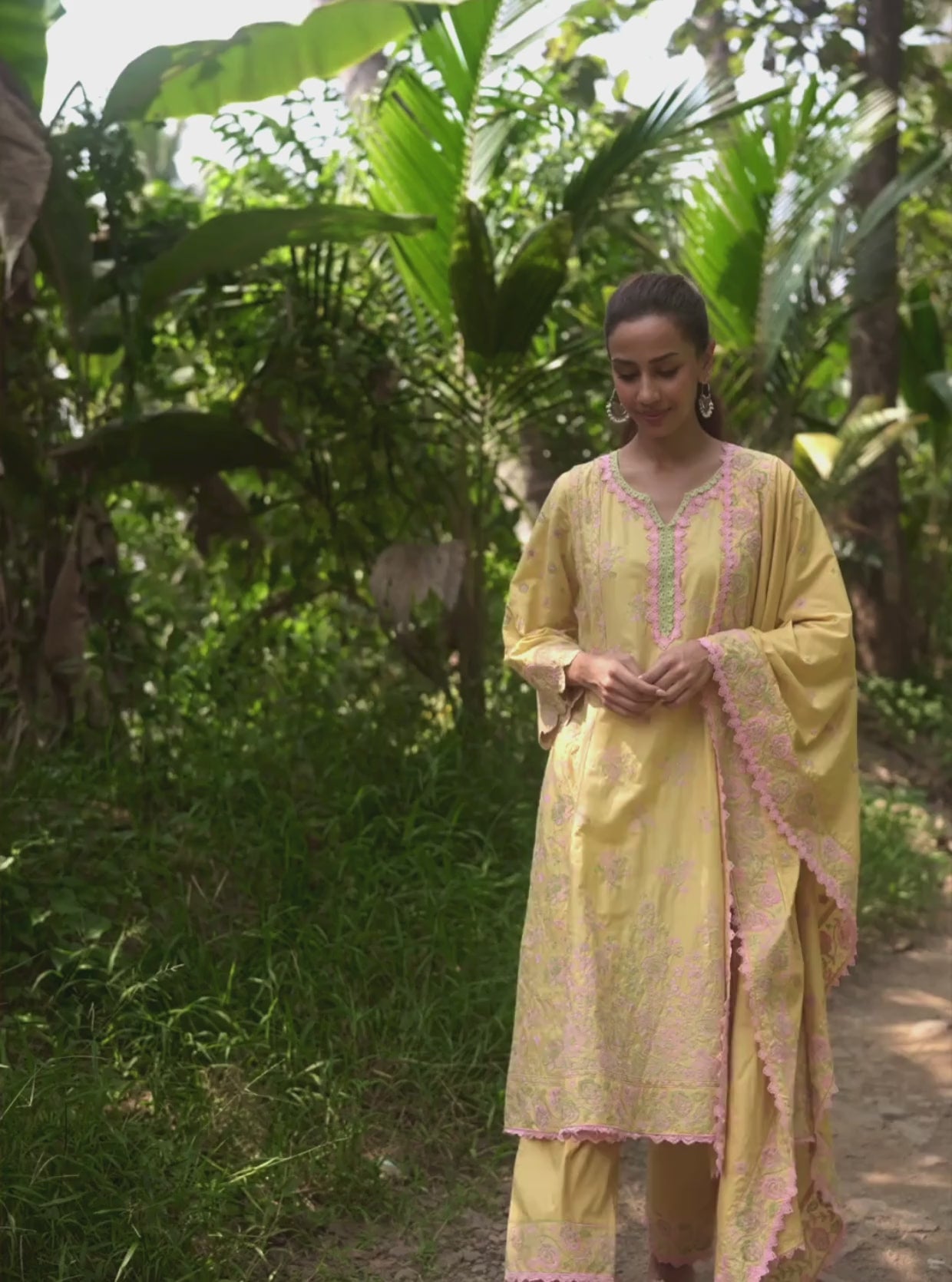 Bask in the warmth of summer with this refreshing lemon-yellow cotton kurta set, thoughtfully designed for the sunlit days ahead. The kurta, tailored from soft and breathable cotton, features delicate floral embroidery in shades of blush pink and mint green. Its notched neckline and scalloped sleeves are accented with intricate lace detailing and embroidery. The relaxed fit and lightweight fabric ensure comfort, making it a perfect choice for daytime gatherings.
