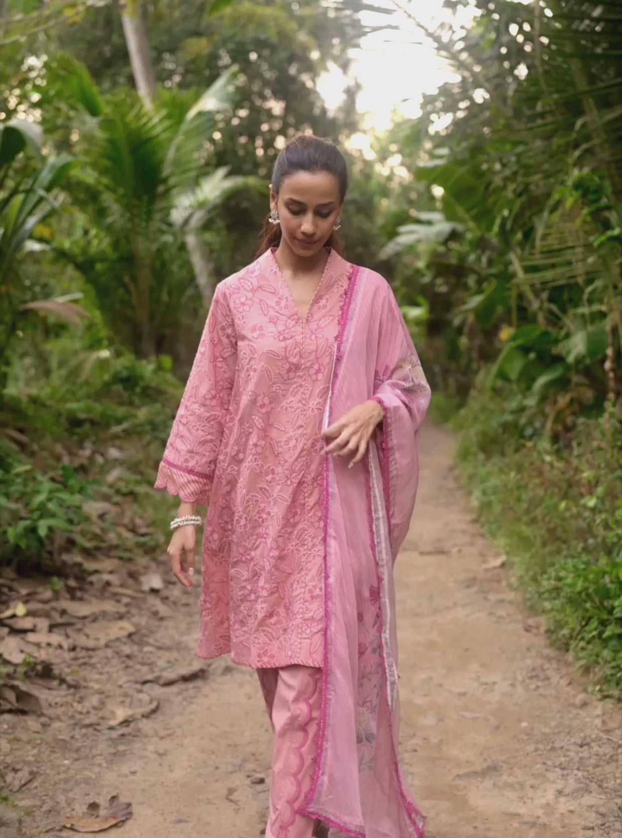 A vision in soft blush pink, this intricately embroidered kurta set is a celebration of femininity. The delicate tonal thread work cascades across the fabric, adding texture and depth to its elegant silhouette. Paired with matching dhoti-style pants featuring intricate lace detailing, this ensemble is elevated with a beautiful dupatta adorned with floral motifs and scalloped edges. The sheer organza adds a dreamy allure, perfect for those who love a blend of sophistication and comfort.