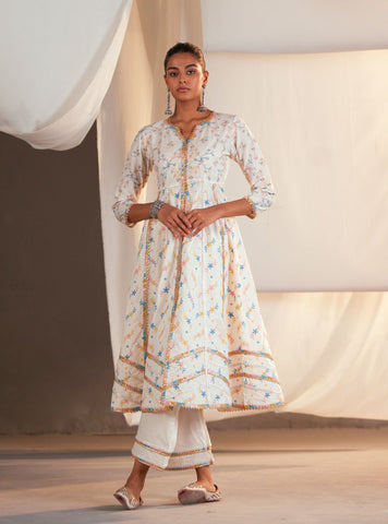 Mulmul Cotton Ayla Anarkali Green Kurta With Ayla Green Pant