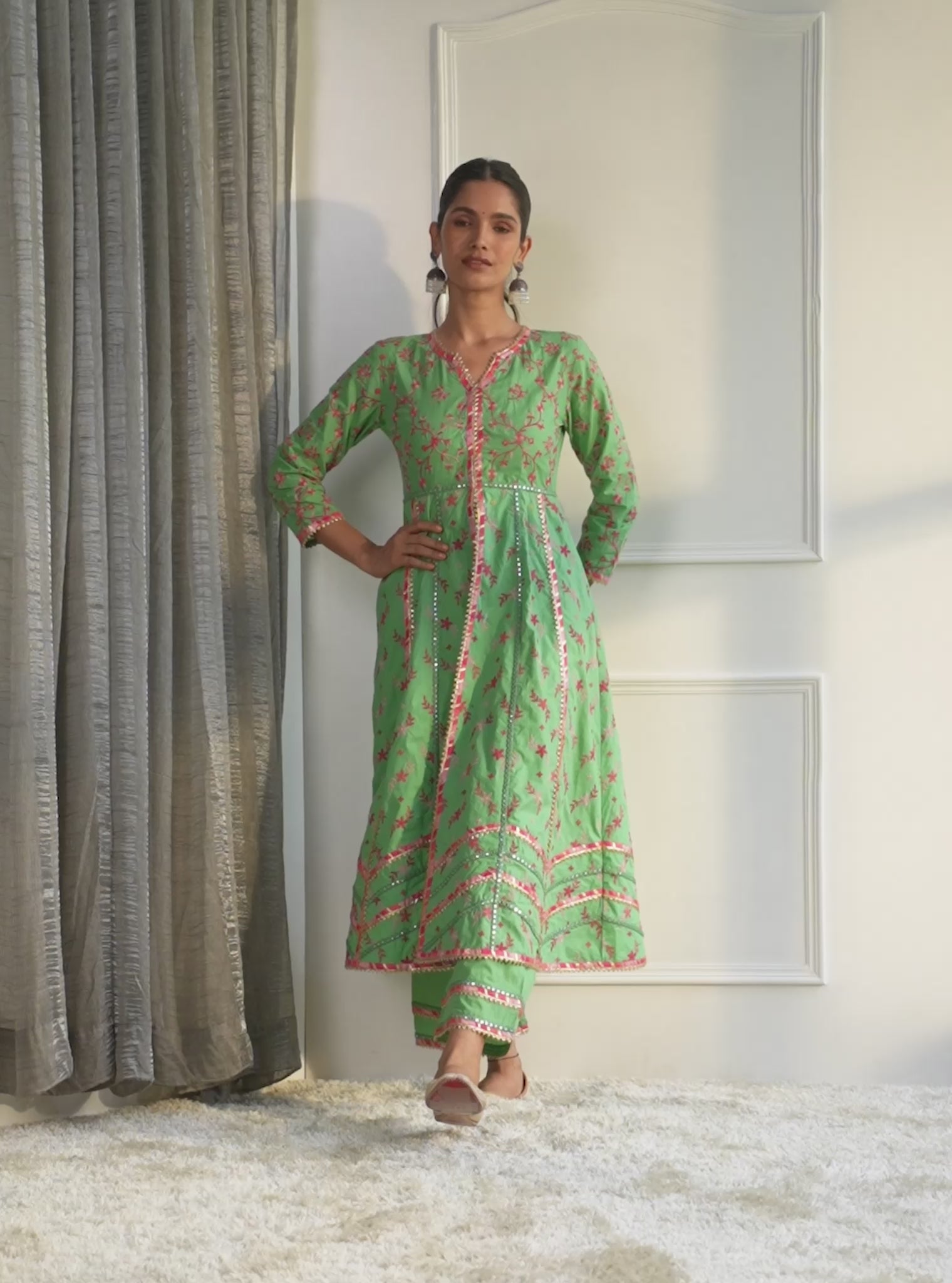 The Ayla set in green is a soothing treat for the eyes! An ensemble of harmonious multi-coloured embroidery on leaf green, this kurta comes in an Anarkali silhouette, fitted at the waist. Finished with mirror and gota the set comes with straight green pants of complimenting work and a refreshing dupatta with solid coloured borders! Wear it anywhere and you'll be the talk of the town.
