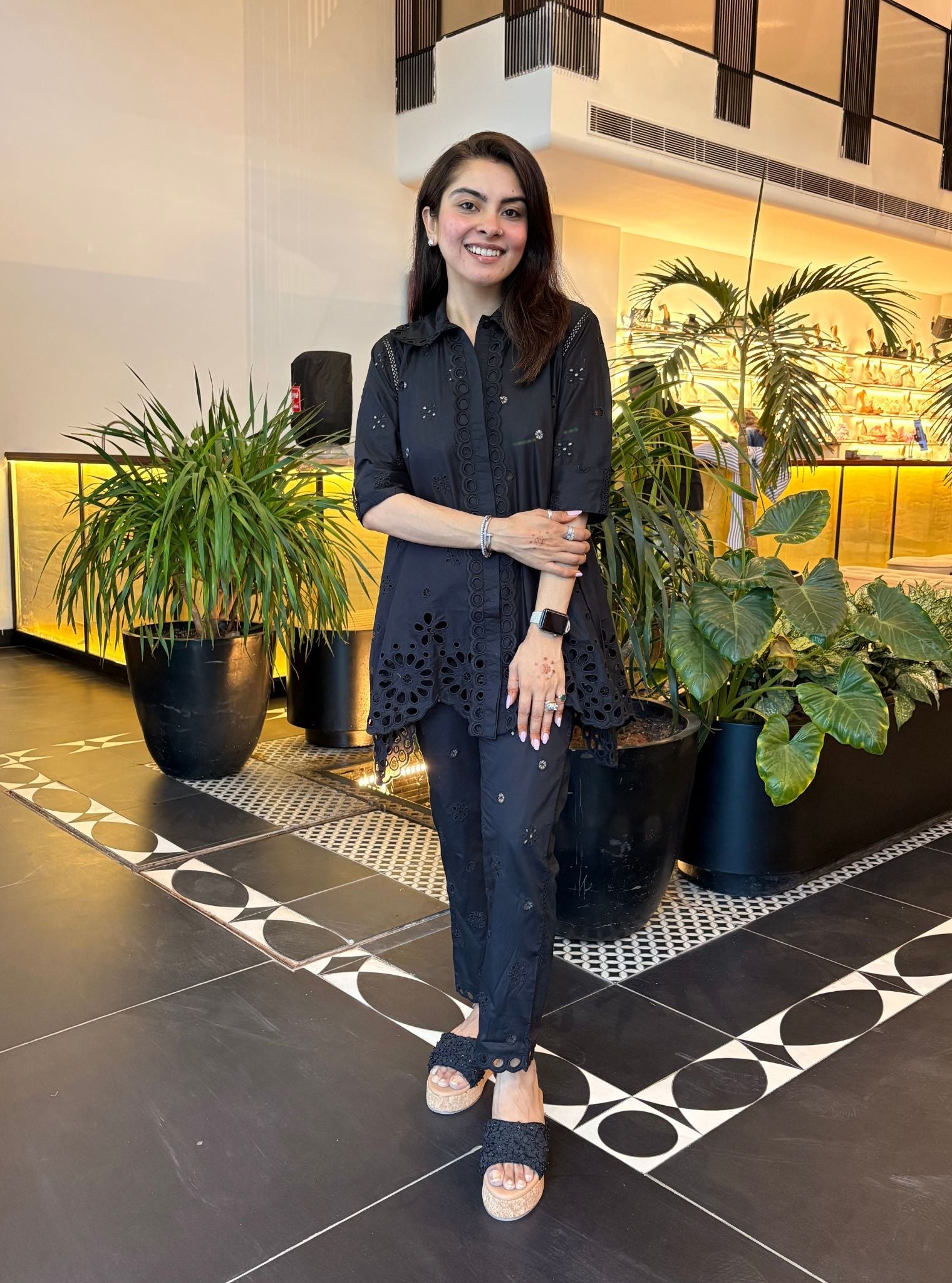 - This cotton co-ord set has an A-line top with an oversized collar. The top has folded cuffs and circular eyelet detail around the collars and placket. The top has big eyelet embroidery with floral and geometric motifs. There is ladder lace details around the armhole, cuff and back yoke.