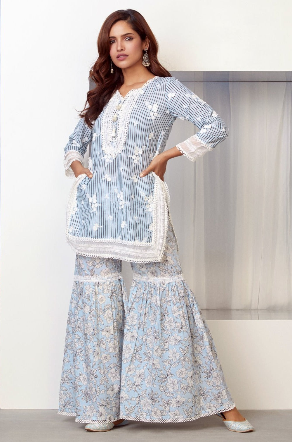 Mulmul Cotton Chelsea Kurta Blue With Chelsea Garara Blue