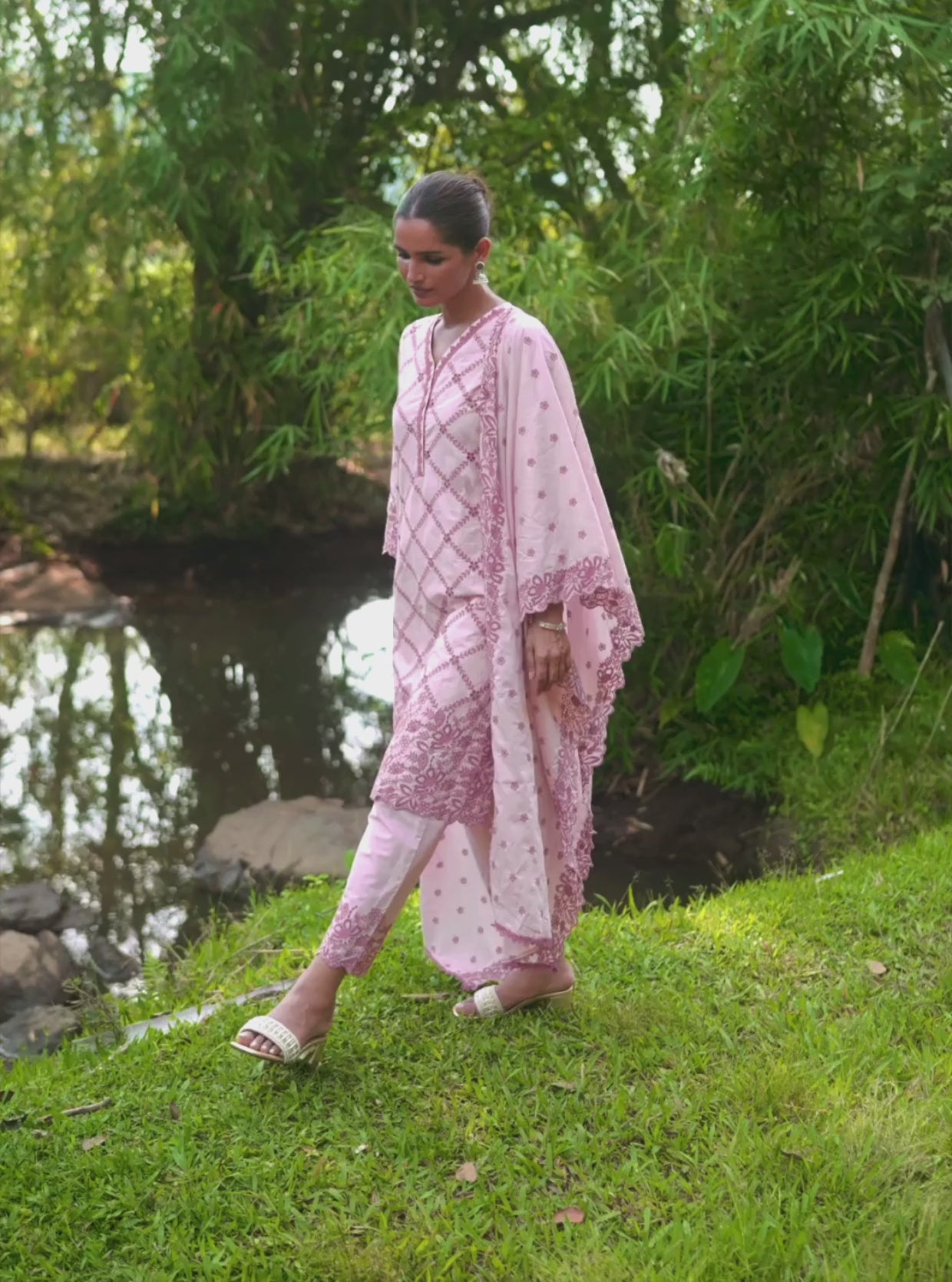 A vision in blushing pastel pink, this kurta set is a timeless piece designed for effortless sophistication. The straight kurta, crafted in a soft cotton, is adorned with delicately contrasting darker tonal embroidery in an intricate floral jaali. The V-neckline and three-quarter sleeves are finished with scalloped lace trims. Paired with classic straight pants featuring matching lace detailing at the hem, this set ensures both comfort and style.
