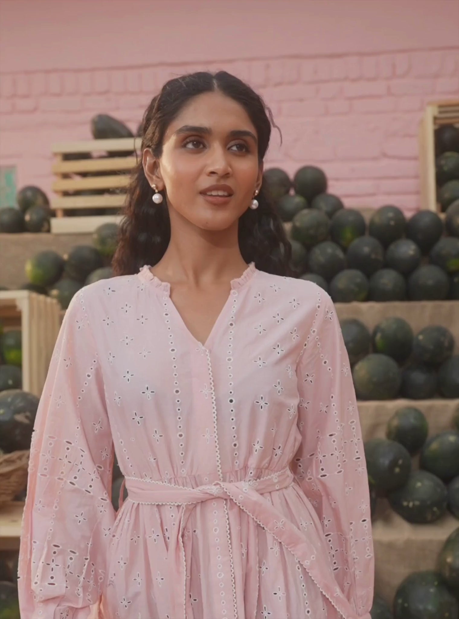 A strikingly elegant cotton dress in a delicate pink. The dress featured a notched neck, peasant sleeves, and a scalloped hem. The dress is adorned with delicate eyelet embroidery all over, forming crosses on the bodice, and flowers at the hem, creating a visually interesting texture. The waist is cinched by a fabric belt with a lace border, to create a flattering silhouette.