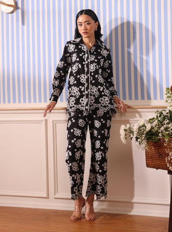The matching straight-cut pants carry the same floral motif, creating a harmonious balance of playfulness and polish. Whether itƒ??s a gallery opening or a stylish staycation, this set brings drama, detail, and undeniable sophistication.