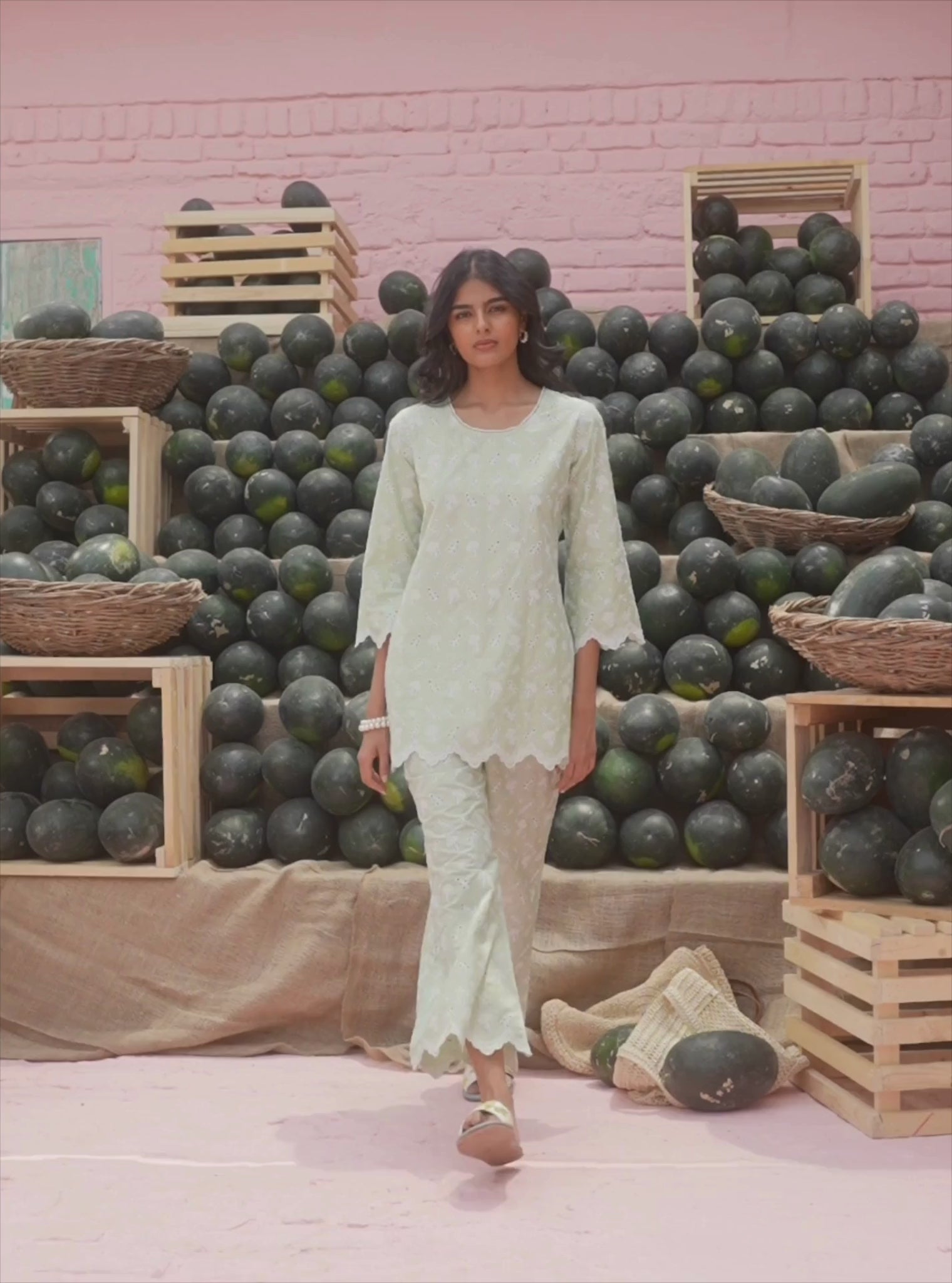 A stylish co-ord set consisting of a long top and wide-leg trousers. The outfit features a delicate eyelet embroidery pattern throughout the fabric, adding an interesting texture. The top has a round neckline and three-quarter sleeves, with a scalloped hem. The trousers are cropped and have a matching scalloped hem, creating a cohesive and harmonious look. The light, pastel green color of the set is perfect for a casual, yet chic appearance. ?ÿ