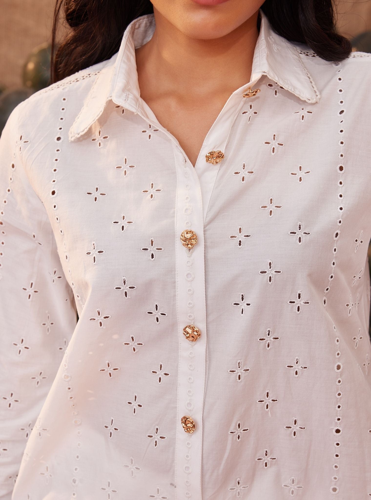 A sophisticated co-ord set in a pristine white color, adorned with intricate eyelet embroidery. This set includes a long-sleeved shirt and matching wide-leg trousers, both decorated with a delicate pattern of cross motifs. The shirt has a classic button-down design with a pointed collar and is finished with a scalloped hem, featuring elaborate lacework. The sleeves are long, with cuffs that add to the structured appeal of the garment. The trousers are wide-legged and cropped, providing a comfortable and stylish fit. They share the same embroidery as the top, creating a cohesive look. The hem of the trousers is also scalloped and adorned with matching lace detailing, adding a touch of elegance to the ensemble.