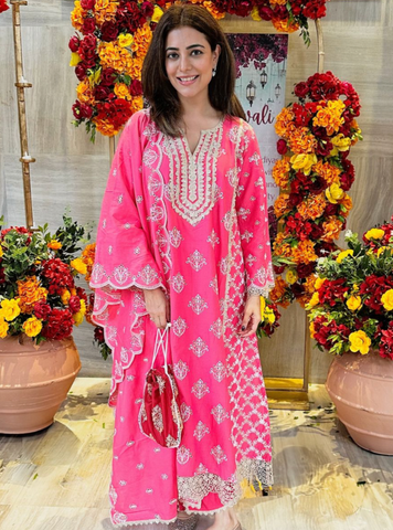 A vibrant fuchsia color kurta set is perfect for your celebrations. The notched neckline is adorned with multiple layers of gotta, adding sheen to the ensemble. The Anarkali silhouette is adorned with alternating panels of intricate traditional embroidery, while the hemline is adorned with intricate lace trim, mirroring the scalloped sleeves. Paired with straight pants, the ensemble gives off a youthful, yet regal feel, making it suitable for all ages. Finish the set with the matching dupatta, with scalloped edges and detailed embroidery.