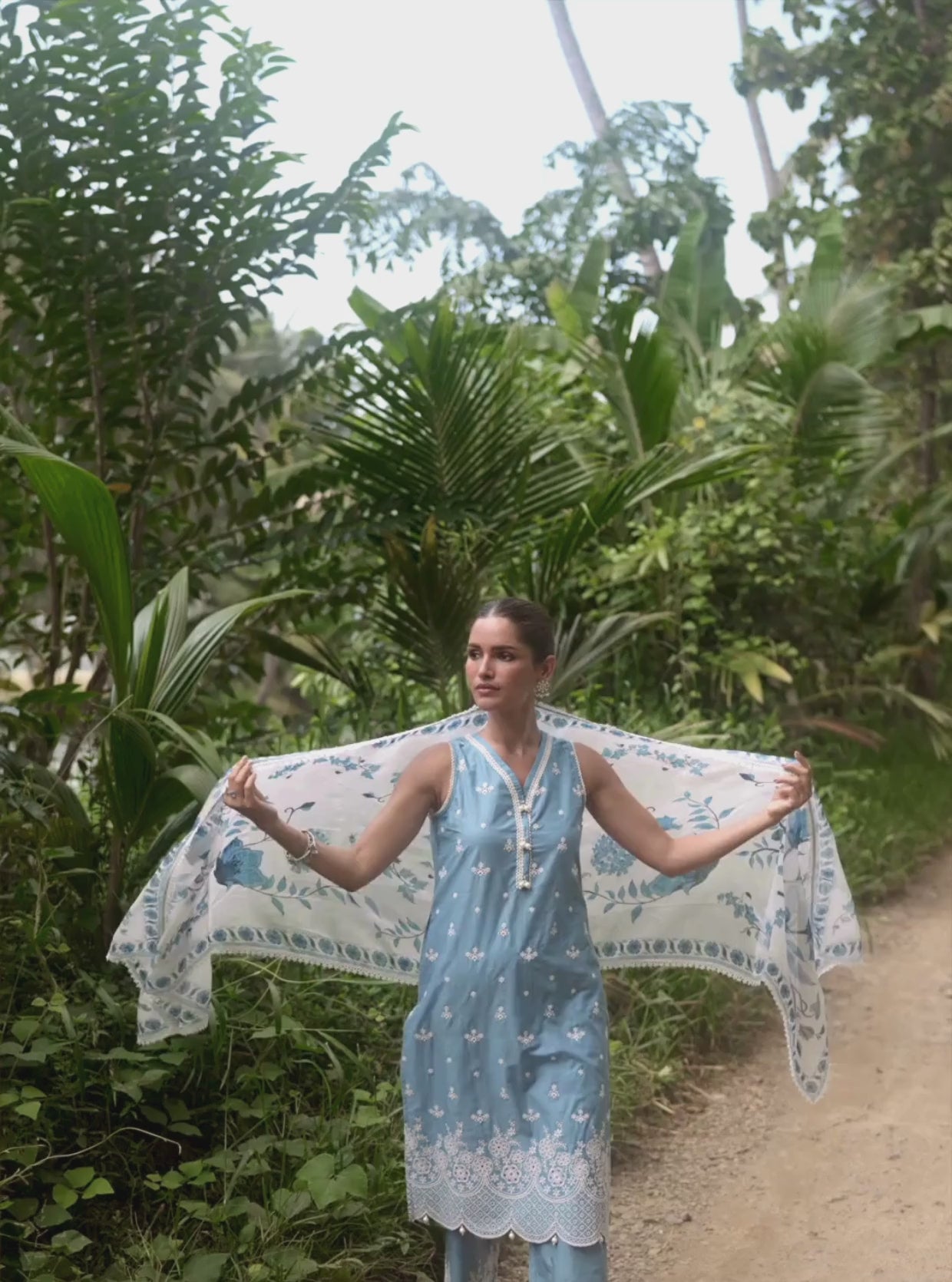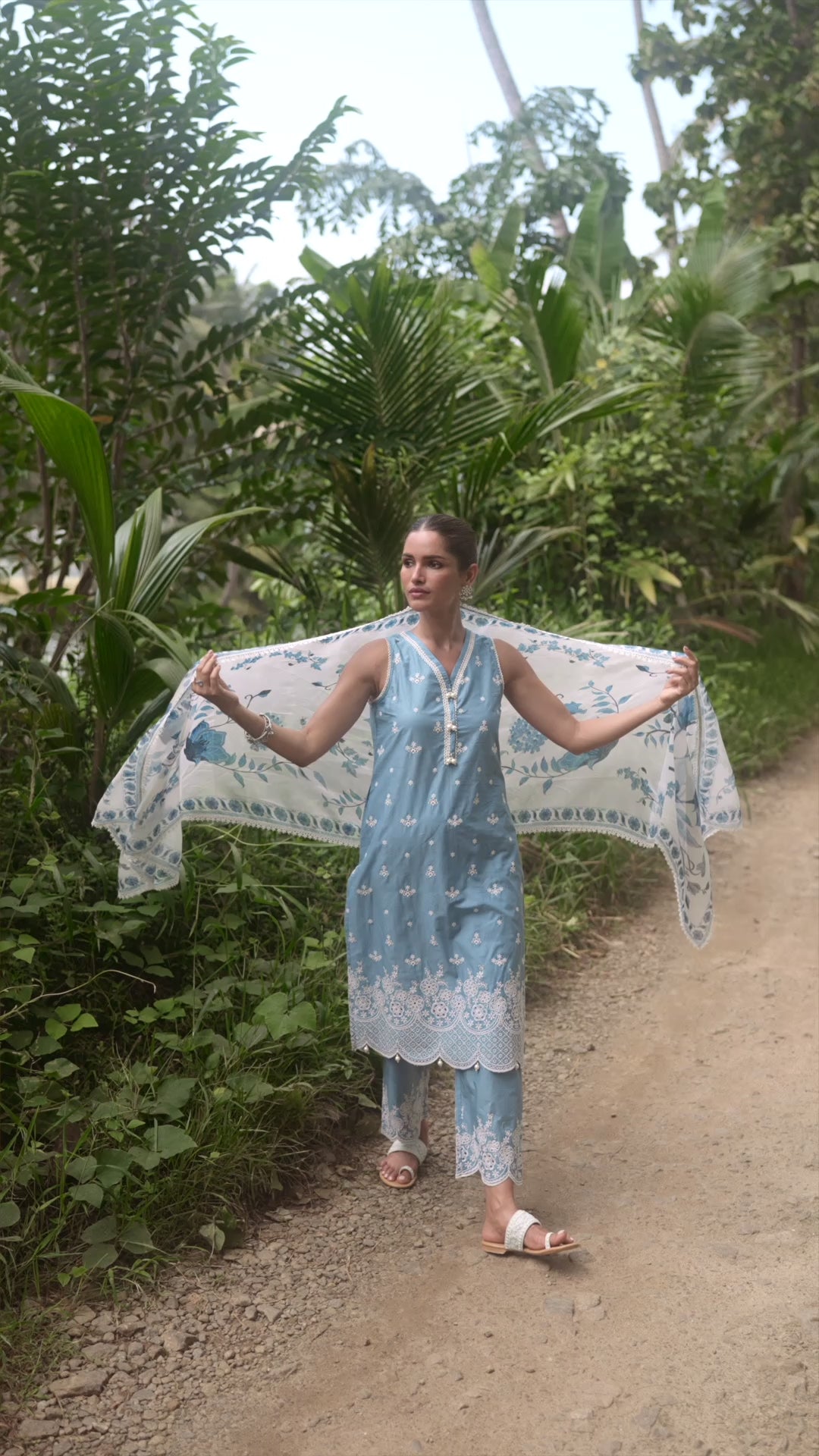 This sleeveless kurta set in serene blue is a breath of fresh air for summer soirées. Crafted from lightweight, breathable cotton, the straight kurta is adorned with delicate white thread embroidery all over. The V-neckline is accentuated with dainty tassels, and the hem is beautifully finished with intricate lace detailing and pearl hangings, enhancing the overall charm of the ensemble.