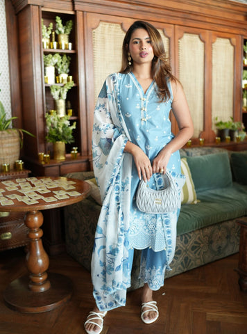 Complementing the kurta are matching straight-fit pants with embroidered cuffs. The ensemble is completed with a lightweight printed dupatta in pastel hues, featuring a blend of floral prints and soft lace borders.