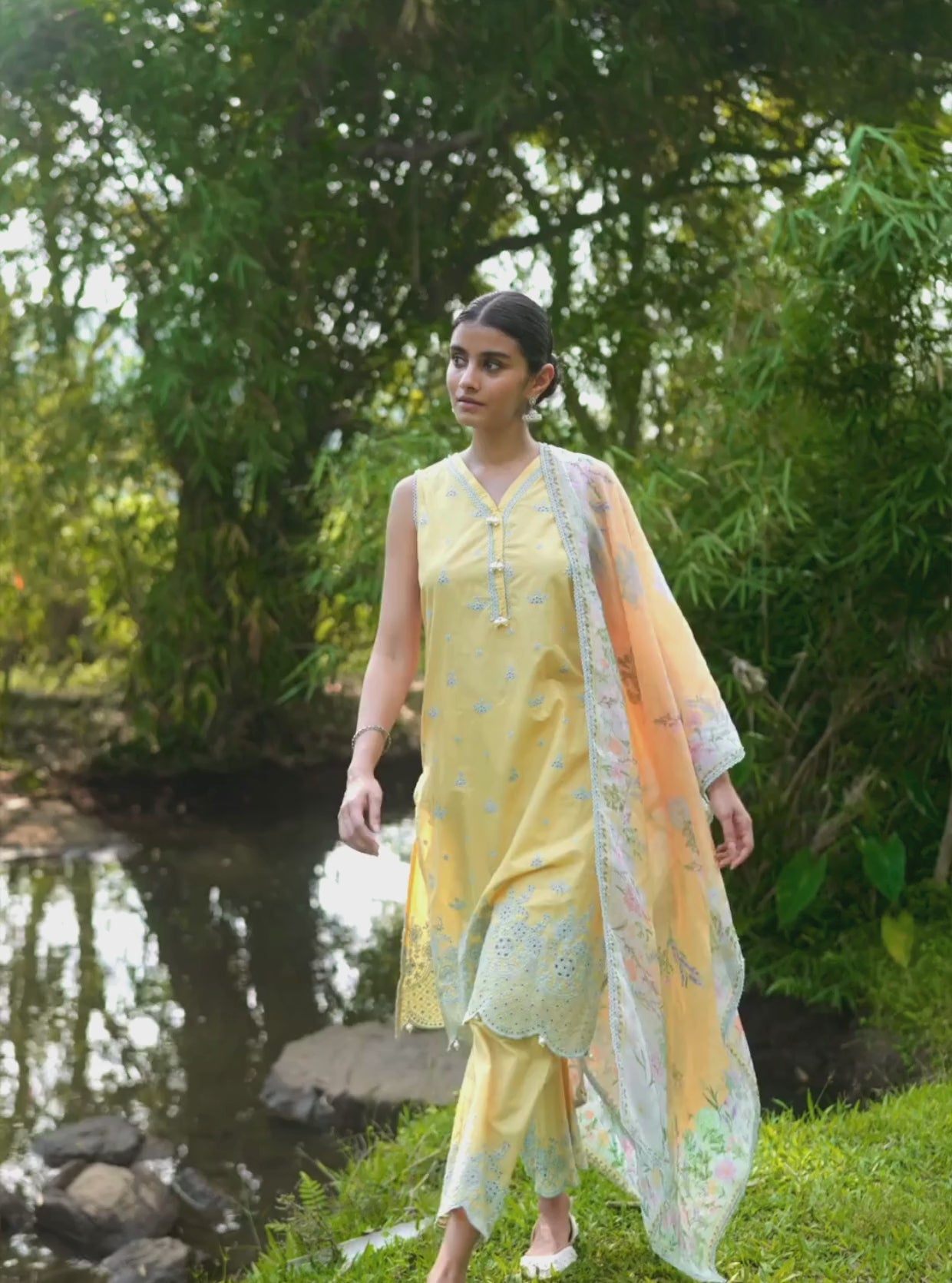 This sleeveless kurta set in a refreshing shade of yellow is a blend of youthful charm and timeless elegance. The kurta features intricate blue thread floral embroidery all over. The V-neckline is adorned with subtle lace trims and pearl details. The ornate scalloped hemline is adorned with delicate pearl hangings, creating a soft and feminine silhouette.