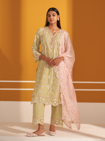 Step into the festive season with this soft green kurta set. The set features a beautifully crafted straight kurta from soft, lightweight cotton, ensuring comfort and style. The delicate white floral embroidery across the neckline, cuffs, and hemline, adds a touch of femininity and grace.