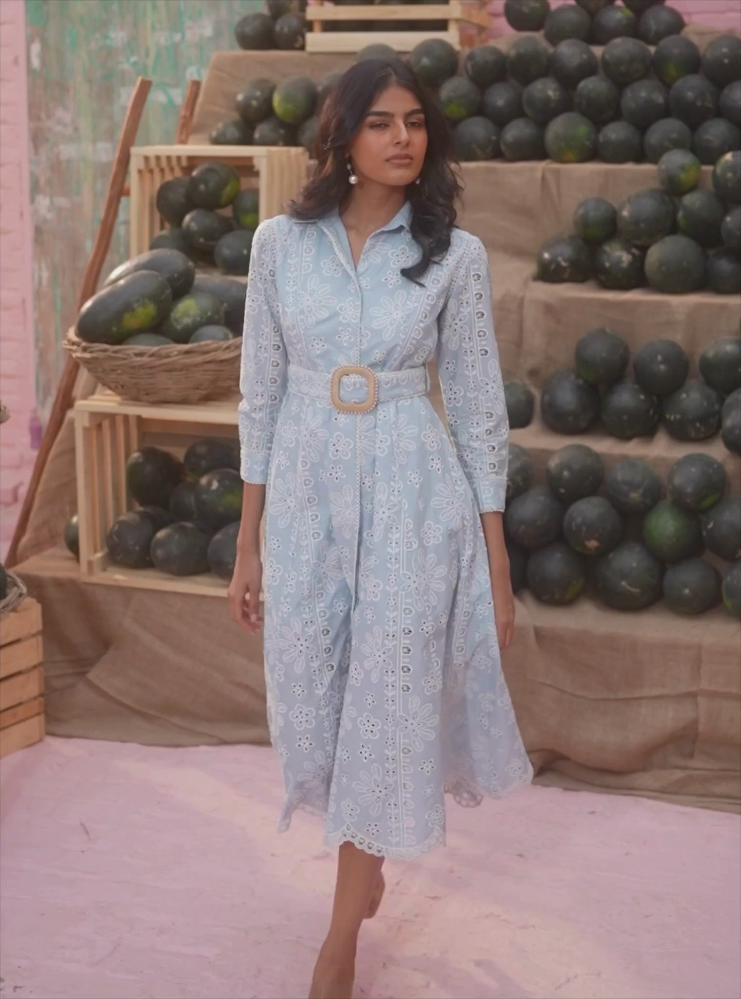 This elegant midi dress features delicate eyelet embroidery and intricate white thread floral patterns adorning a serene blue fabric. The subtle contrast between the embroidery and the base creates a sophisticated feminine look. Full cuffed sleeves and a defined collar add a touch of structure, while the waist is cinched with a matching fabric belt, complete with a stunning buckle detail.