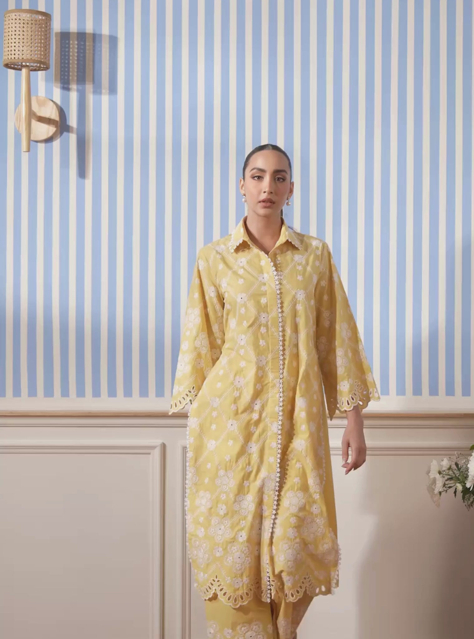 Step into effortless elegance with this playful yellow ¶ÿco-ord set, adorned with floral embroidery and intricate lattice detailing. The kurta features a sharp shirt collar, front placket, and graceful 3/4th bell sleevesƒ??all framed with scalloped edges that add a touch of femininity to the structured silhouette.