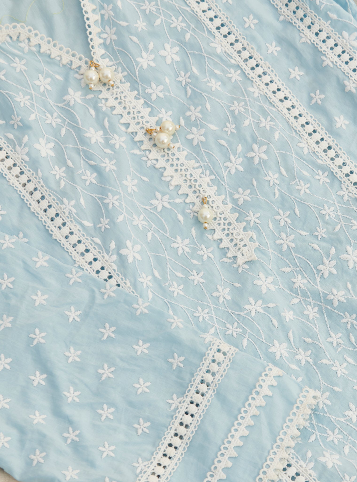 A straight kurta with ladder lace and pearl detailing on the neck. Vertical panel detailing. Also has a geometric lace border at the bottom. Cotton dupatta with panel detailing and 3D embroidery. Rounded hem straight embroidered cotton pants with lace detailing.