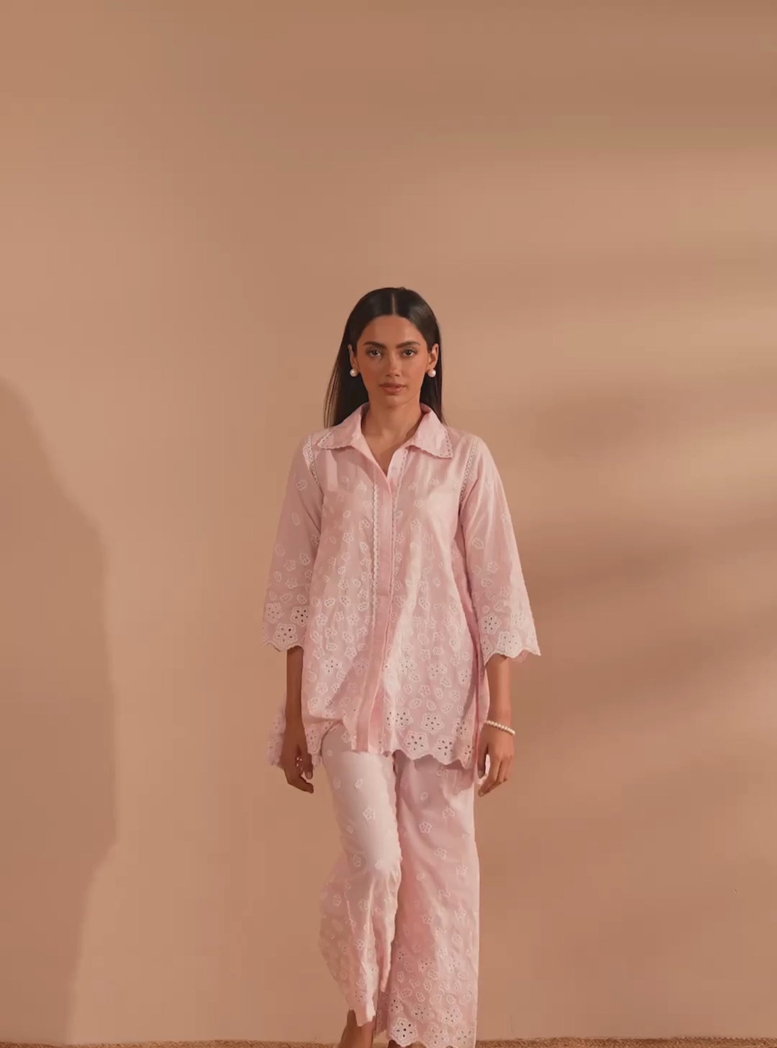 Bring understated elegance to your everyday wardrobe. This set is defined by its all-over white embroidery, on the pastel pink base, that grows denser along the hemline and cuffs, ending in delicately scalloped edges.