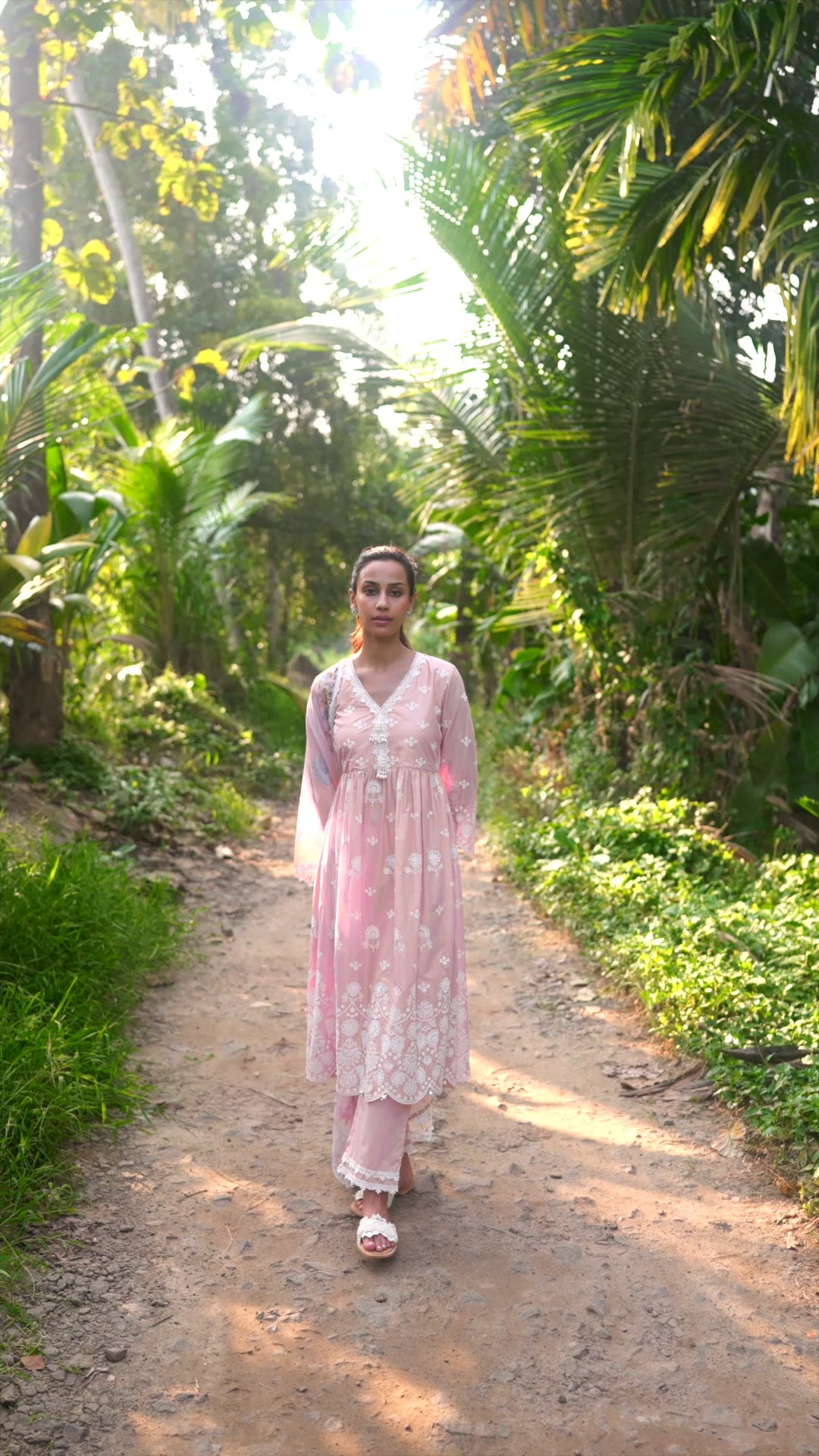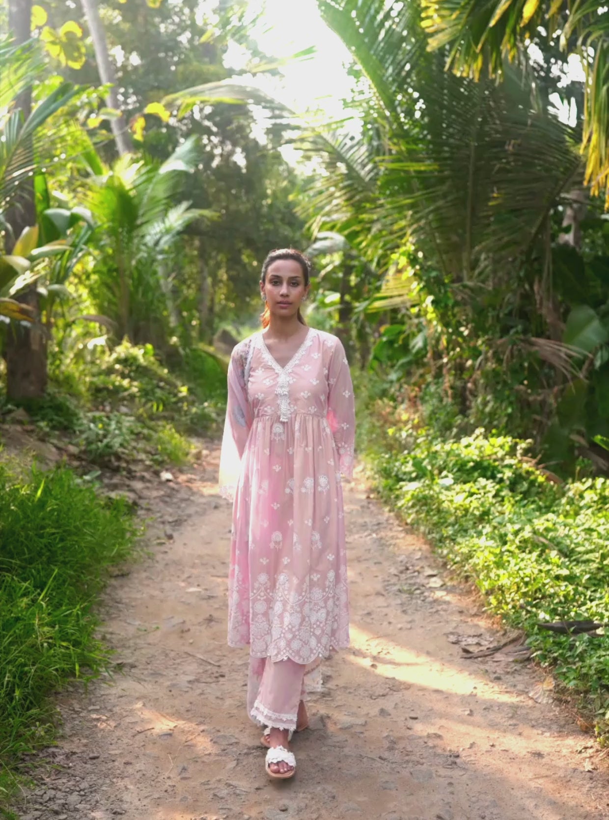 Embrace the soft allure of summer with this pastel pink cotton Anarkali set, a perfect blend of grace and comfort. The Anarkali is crafted from breathable cotton and adorned with delicate white thread embroidery. The notched V-neckline and scalloped sleeves are accentuated with lace and embroidery detailing that enhances the feminine appeal of the ensemble. The flared silhouette ensures effortless elegance and ease of movement for warm days.