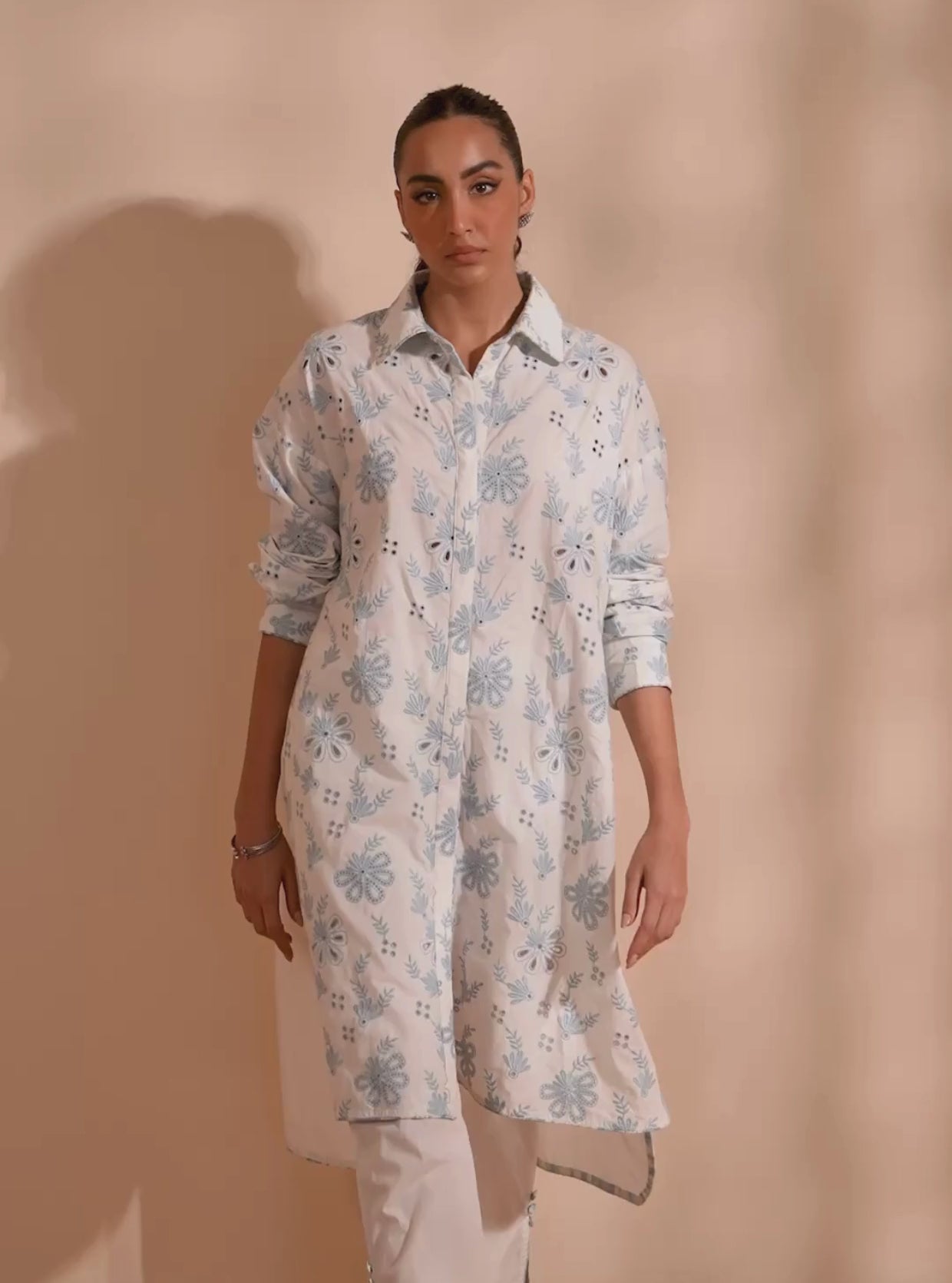 Minimalism meets refined elegance in this effortlessly stylish co-ord set. Featuring a high-low shirt kurta in a crisp ivory base, the ensemble is adorned with delicate blue floral prints inspired by botanical emboirder — lending it a quiet charm and versatility.