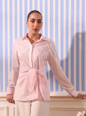 A modern classic with a romantic twist. This black shirt is elevated with delicate embroidered motifs scattered gracefully across the fabric, while its true charm lies in the unique wrap-around detail that cinches the waist with a soft tieƒ??adding structure, femininity, and a hint of drama.
